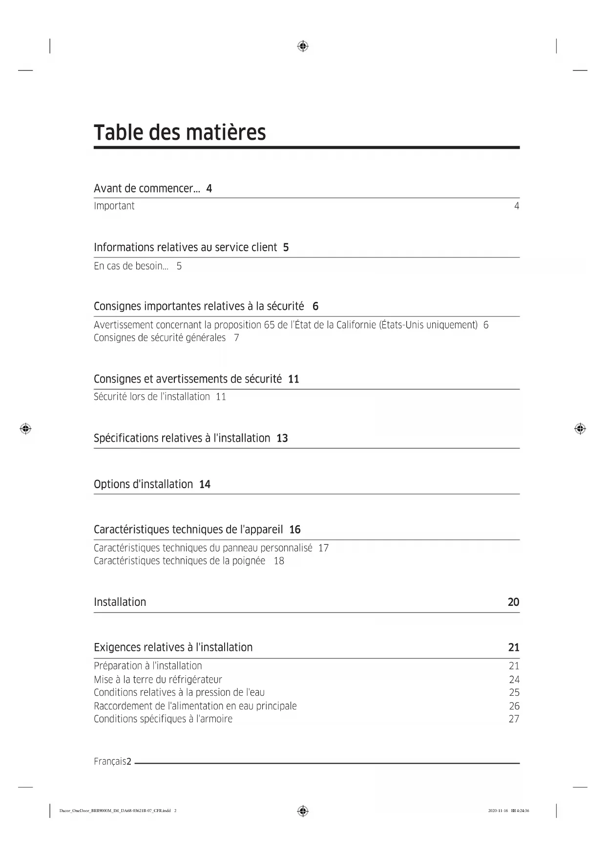 - Il incombe au propriétaire de procéder à une bonne installation. La bonne installation de votre appareil Dacor est essentielle et ne doit pas être négligée. Liste de vérifications pour l'installation Les éventuels dommages superficiels de l'appareil ont-ils été inspectés ? La conduite d'eau a-t-elle été correctement installée en conformité avec les spécifications et la recherche d'éventuelles fuites a-t-elle été effectuée ? L'appareil est-il correctement aligné avec les armoires adjacentes ? Les portes, tiroirs et clayettes fonctionnent-ils de façon fluide et sans interférences ? L'emballage, les rubans et autres documents ont-ils été retirés des parties internes et externes de l'appareil ? Le câble d'alimentation est-il branché à une prise électrique de mise à la terre à trois broches conforme aux spécifications électriques ? L'appareil a-t-il été correctement mis à niveau ? Le support antibasculement a-t-il été correctement installé ? Le système d'ouverture automatique de la porte fonctionne-t-il correctement ? Les composants du réfrigérateur fonctionnent-ils tous correctement ? La garantie a-t-elle été activée en ligne / la carte de garantie a-t-elle été complétée et transmise ? Dacor_OneDoor_BRR9000M_IM_DA68-03621B-07_CFR.indd 65 2020-11-16 4:24:53Mémo Dacor_OneDoor_BRR9000M_IM_DA68-03621B-07_CFR.indd 66 2020-11-16 4:24:53Mémo Dacor_OneDoor_BRR9000M_IM_DA68-03621B-07_CFR.indd 67 2020-11-16 4:24:54Dacor ∙ 14425 Clark Avenue, City of Industry, CA 91745 ∙ Tél. : (833) 353-5483 ∙ Fax : (626) 403-3130 ∙ www.dacor.com DA68-03621B-07 Dacor_OneDoor_BRR9000M_IM_DA68-03621B-07_CFR.indd 68 2020-11-16 4:24:54