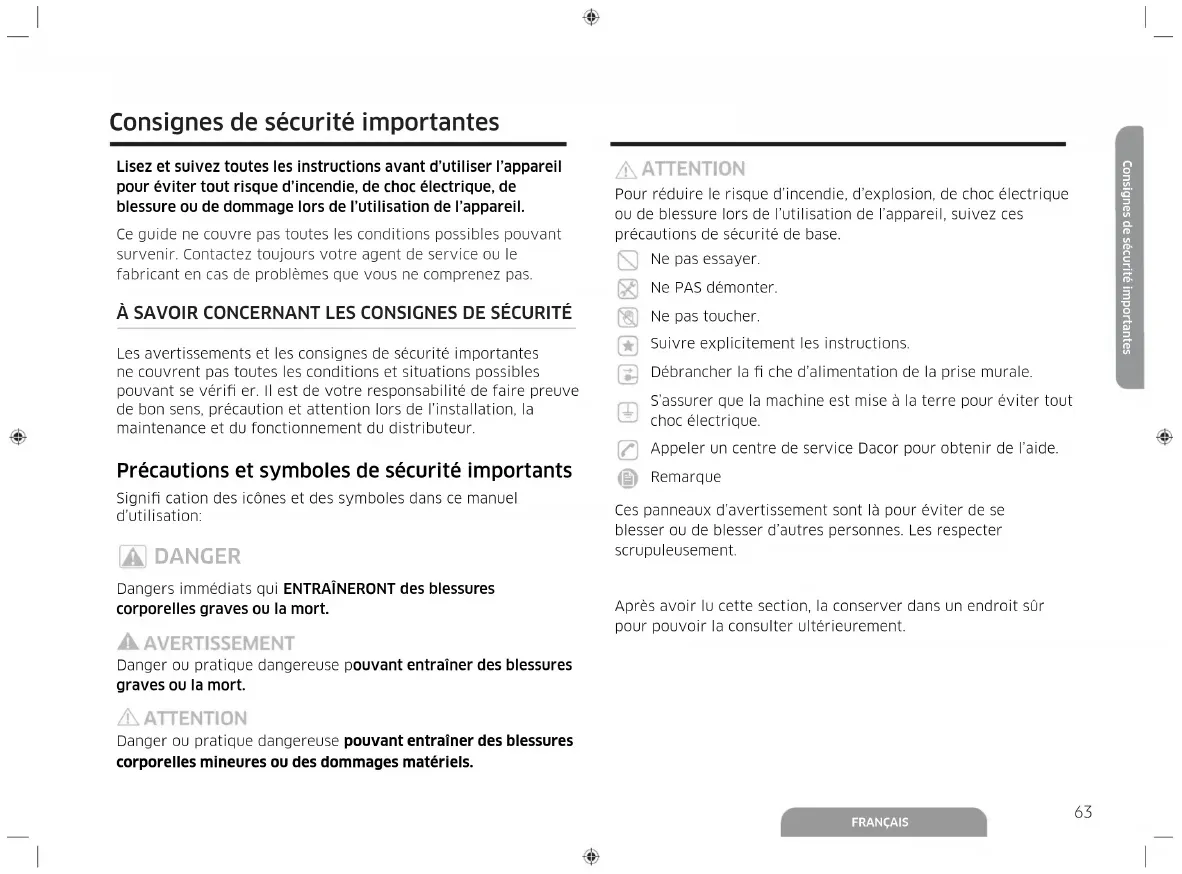 - Si la porte est endommagée, ne pas utiliser l'appareil. Contacter un centre de service Dacor.66 FRANÇAIS Consignes de sécurité importantes Consignes de sécurité importantes Cet appareil n’est pas destiné à être utilisé par de jeunes enfants ou des personnes non quali ées sans la surveillance adéquate d’un adulte responsable. Les jeunes enfants doivent être surveillés pour s’assurer qu’ils ne jouent pas avec l’appareil. Tenez les enfants éloignés de la porte lors de son ouverture ou de sa fermeture, car ils pourraient se cogner contre la porte ou se coincer les doigts dans la porte.