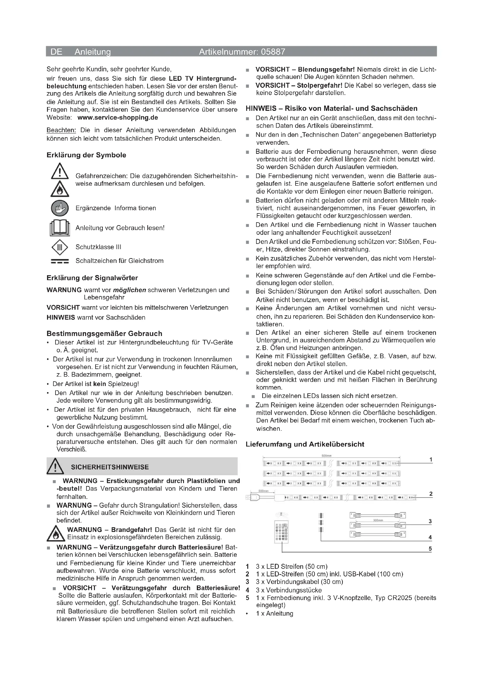 push pull Z 05887 M DS V3 0318FR Mode d'emploi Chère cliente, cher client, Nous nous réjouissons que vous ayez décidé d’acheter ce rétro- éclairage de télévision à LED. Veuillez lire attentivement ce mode d‘emploi avant la première utilisation de l‘appareil et le conserver précieusement. Il fait partie intégrante de l‘appareil. Pour toute question, veuillez contacter le service après-vente depuis notre site Internet : www.service-shopping.de À noter : les illustrations utilisées dans ce mode d‘emploi peuvent légèrement diverger des caractéristiques de ce produit tel qu‘il est réellement. Explication des symboles Mentions de danger : ces symboles signalent des risques de blessure. Lisez et observez attentivement la consigne de sécurité correspondante. Informations complémentaires Consultez le mode d'emploi avant utilisation ! Classe de protection III Signe de commutation pour le courant continu Explication des mentions d‘avertissement AVERTISSEMENT Vous alerte devant le risque potentiel de blessures graves ou mortelles ATTENTION Vous alerte devant le risque de blessures bénignes ou de moyenne gravité AVIS Vous alerte devant le risque de dégâts matériels Utilisation conforme