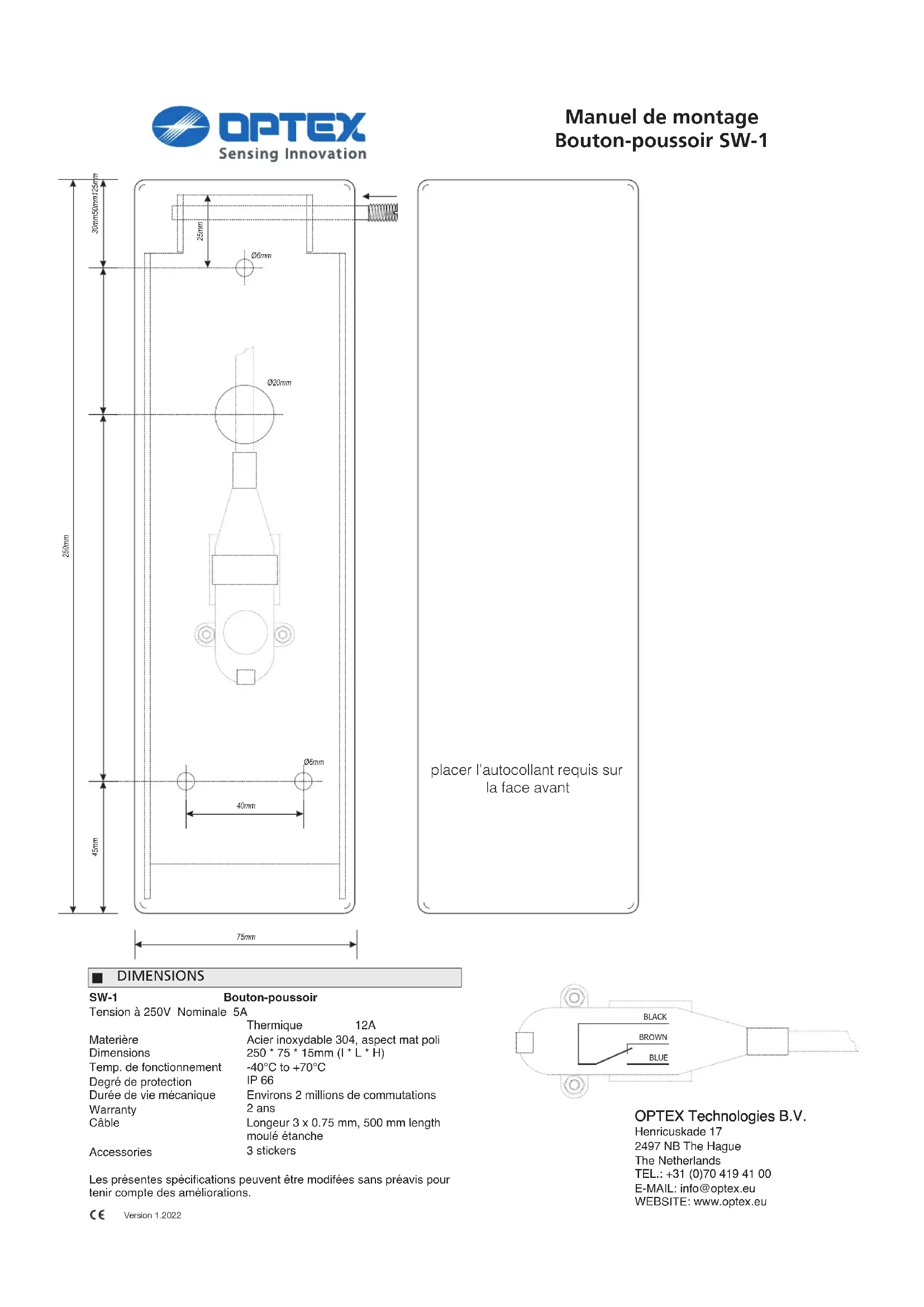Manuel de montage Bouton-poussoir SW-1 DIMENSIONS SW-1 Bouton-poussoir Tension à 250V Nominale 5A Thermique 12A Materière Dimensions Temp. de fonctionnement Degré de protection Durée de vie mécanique Warranty Câble Accessories Acier inoxydable 304, aspect mat poli 250 * 75 * 15mm (I * L * H) -40°C to +70°C IP 66 Environs 2 millions de commutations 2 ans Longeur 3 x 0.75 mm, 500 mm length moulé étanche 3 stickers Les présentes spécications peuvent être modifées sans préavis pour tenir compte des améliorations. Version 1.2022 BLACK BLUE BROWN 75mm Ø 6mm Ø 20mm Ø 6mm 40mm 30mm50mm125mm 250mm 45mm 25mm placer l'autocollant requis sur la face avant OPTEX Technologies B.V. Henricuskade 17 2497 NB The Hague The Netherlands TEL.: +31 (0)70 419 41 00 E-MAIL: info@optex.eu WEBSITE : www.optex.euManuel de montage Bouton-poussoir SW-2 Dimensions SW-2 Bouton-poussoir Tension à 250V Nominale 5A Thermique 12A Materière Dimensions Temp. de fonctionnement Degré de protection Durée de vie mécanique Warranty Câble Accessories Acier inoxydable 304, aspect mat poli 150 * 55 * 15mm (I * L * H) -40°C - +70°C IP 66 Environs 2 millions de commutations 2 ans Longeur 3 x 0.75 mm, 500 mm length moulé étanche 3 stickers Les présentes spécications peuvent être modifées sans préavis pour tenir compte des améliorations. Version 1.2022 BLACK BLUE BROWN 55mm Ø 6mm Ø 18mm Ø 6mm 26mm 23mm18mm88mm 150mm 21mm 20mm OPTEX Technologies B.V. Henricuskade 17 2497 NB The Hague The Netherlands TEL.: +31 (0)70 419 41 00 E-MAIL: info@optex.eu WEB SITE: www.optex.eu placer l'autocollant requis sur la face avant