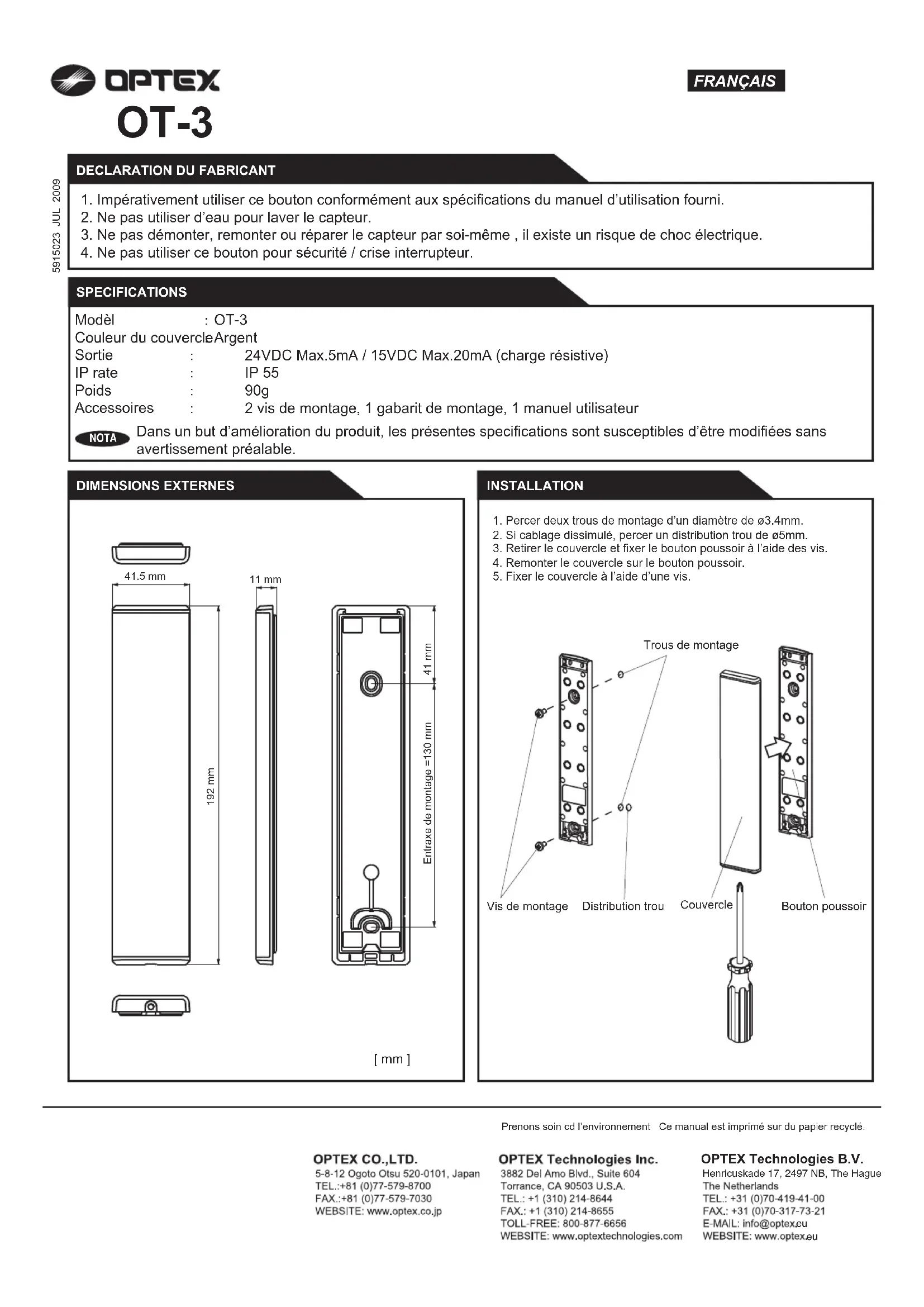OT-3 FRANÇAIS Modèl Couleur du couvercle Sortie IP rate Poids Accessoires :OT-3 :Argent :24VDC Max.5mA / 15VDC Max.20mA (charge résistive) :IP 55 :90g :2 vis de montage, 1 gabarit de montage, 1 manuel utilisateur NOTA Dans un but d’amélioration du produit, les présentes specifications sont susceptibles d’être modifiées sans avertissement préalable. Installation Prenons soin cd l’environnement Ce manual est imprimé sur du papier recyclé.41.5 mm11 mm192 mmEntraxe de montage =130 mm [ mm ]