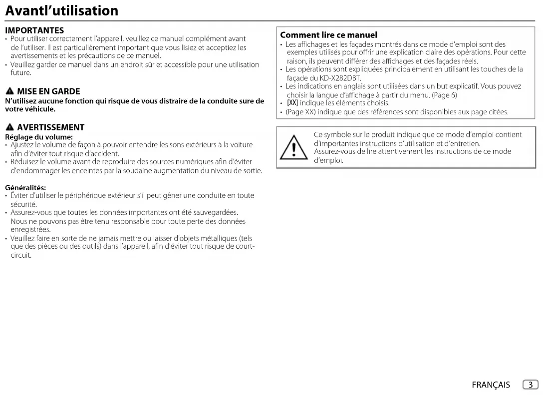 - (PageXX) indique que des références sont disponibles aux page citées. Ce symbole sur le produit indique que ce mode d’emploi contient d’importantes instructions d’utilisation et d’entretien. Assurez-vous de lire attentivement les instructions de ce mode d’emploi. KD-X282DBT_E_FR.indd 3KD-X282DBT_E_FR.indd 3 30/3/2022 4:48:24 PM30/3/2022 4:48:24 PM4 FRANÇAIS Data Size: B6L (182 mm x 128 mm) Book Size: B6L (182 mm x 128 mm) Fonctionnement de base Façade Pour Sur la façade Mettez l’appareil sous tension Appuyez sur B SRC.