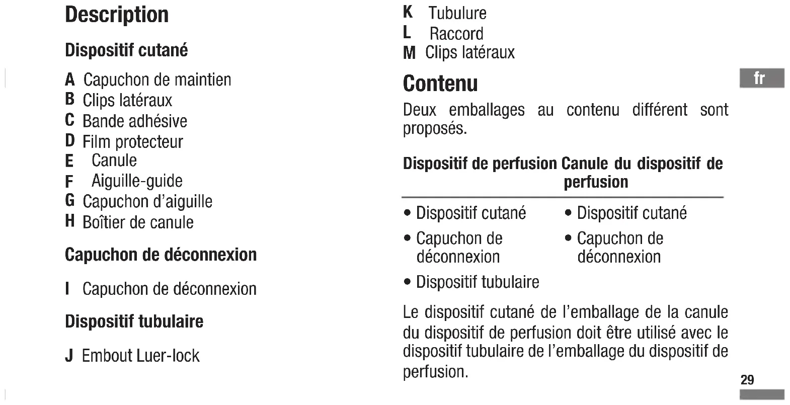 Clips latéraux Contenu Deux emballages au contenu diérent sont proposés. Dispositif de perfusion Canule du dispositif de perfusion