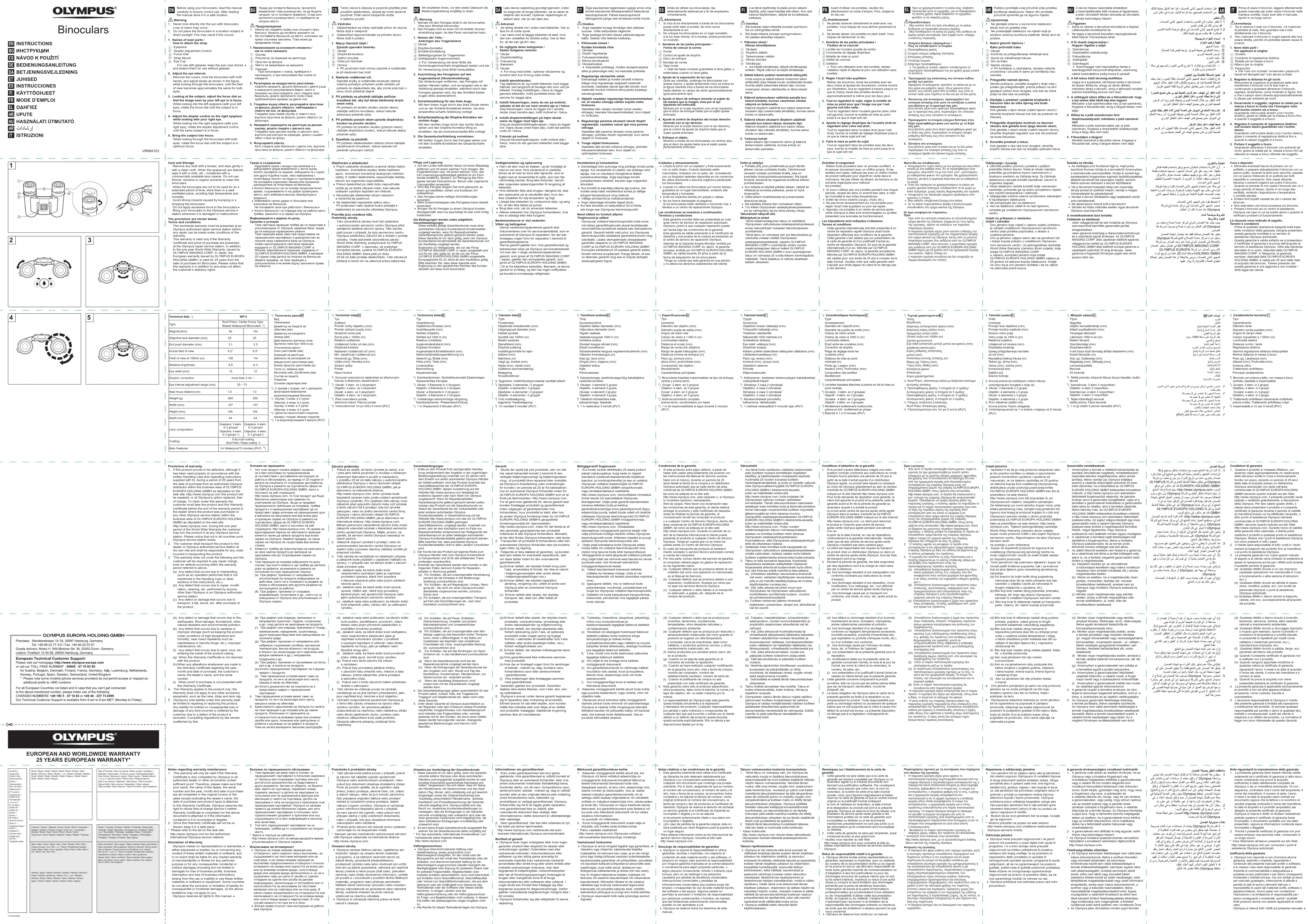 | Caractéristiques techniques | Jumelles OLYMPUS 10X25WP II, grossissement 10x, diamètre de l'objectif 25 mm, champ de vision à 1000 m : 100 m, distance minimale de mise au point : 3 m. |