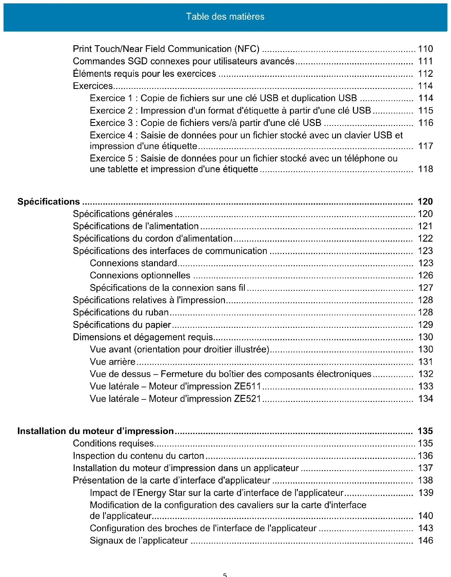 - Moteur d'impression industrielle ZE511/ZE521 P1117212-01FR Guide d'utilisation2 ZEBRA et le logo Zebra sont des marques commerciales de Zebra Technologies Corporation, déposées dans de nombreuses juridictions à travers le monde. Toutes les autres marques sont la propriété de leurs détenteurs respectifs. © 2021 Zebra Technologies Corporation et/ou ses sociétés affiliées. Tous droits réservés. Les informations contenues dans ce document sont susceptibles d'être modifiées sans préavis. Le logiciel décrit dans ce document est fourni dans le cadre d’un accord de licence ou d’un accord de non- divulgation. Le logiciel peut être utilisé ou copié uniquement selon les conditions de ces accords. Pour plus d'informations concernant les déclarations légales, consultez les pages suivantes : LOGICIELS : zebra.com/linkoslegal DROITS D'AUTEUR : zebra.com/copyright GARANTIE : zebra.com/warranty LICENCE UTILISATEUR FINAL : zebra.com/eula Conditions d'utilisation Déclaration d'exclusivité Ce manuel contient des informations exclusives appartenant à Zebra Technologies Corporation et à ses filiales (« Zebra Technologies »). Il est destiné exclusivement à informer le personnel chargé du fonctionnement et de la maintenance de l'équipement décrit ici. Ces informations exclusives ne doivent être utilisées, reproduites ou divulguées à aucun tiers, et pour quelque but que ce soit, sans l'autorisation écrite explicite de Zebra Technologies. Amélioration du produit L'amélioration constante des produits fait partie de la politique de Zebra Technologies. Tous les designs et spécifications sont soumis à des modifications sans préavis. Exclusion de responsabilité Zebra Technologies s'efforce de publier des spécifications et des manuels techniques exacts. Toutefois, des erreurs peuvent se produire. Zebra Technologies se réserve le droit de corriger ces erreurs et décline toute responsabilité en la matière. Limitation de responsabilité Zebra Technologies ou toute autre partie impliquée dans la création, la production ou la fourniture du produit joint (y compris matériel et logiciel) ne peut en aucun cas être tenue pour responsable de dommages quels qu'ils soient (y compris, mais sans s'y limiter, les dommages consécutifs, notamment la perte de bénéfices ou de données et l'interruption d'activité) résultant de, ou liés à l'utilisation du produit ou à l'impossibilité de l'utiliser, même si Zebra Technologies a eu connaissance de la possibilité de tels dommages. Certaines juridictions n'acceptent pas l'exclusion ou la limitation des dommages accidentels ou consécutifs, par conséquent, la limitation ou l'exclusion ci-dessus peut ne pas s'appliquer à votre situation. Date de publication 24 juin 20213 Table des matières Introduction p. 7