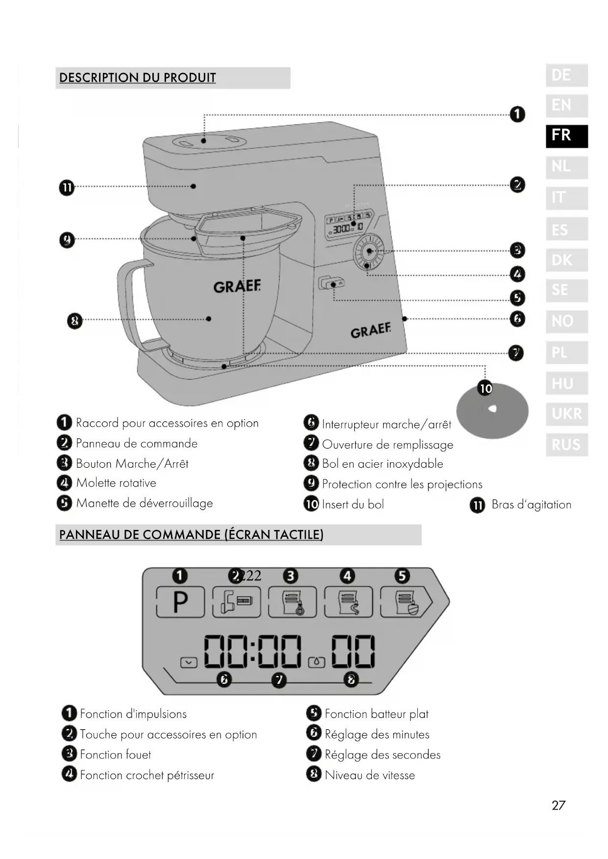 UKR RUS INDICATIONS GÉNÉRALES SUR LA SÉCURITÉ Cet appareil est conforme aux dispositions de sécurité prescrites. Une utilisation non-conforme peut néanmoins entraîner des dommages pour les personnes et les objets. Pour une manipulation sûre de cet appareil, veuillez respecter les consignes de sécurité suivantes: ● Avant utilisation, veuillez contrôler l'absence de dommages extérieurs visibles sur le boîtier, le câble et la fiche d'alimentation. Ne faites pas fonctionner un appareil endommagé. ● Les réparations ne doivent être effectuées que par un technicien spécialisé ou le service clientèle de Graef. Les réparations non-conformes peuvent entraî- ner des dangers considérables pour l'utilisateur. En outre, elles annulent tous droits de garantie. ● Les pièces défectueuses ne doivent être remplacées que par des pièces de rechange originales. Seules ces pièces permettent de garantir les exigences en matière de sécurité. ● Cet appareil ne doit pas être utilisé par des enfants. L‘appareil et son câble de raccordement doivent être tenus hors de la portée des enfants. ● Les enfants doivent rester sous surveillance, afin de s‘assurer qu‘ils ne jouent pas avec l‘appareil. ● Cet appareil peut aussi être utilisé par des personnes à capacité physiques, sensorielles ou mentales réduites ou ayant un manque d‘expérience et/ou de savoir, lorsqu‘ils sont surveillés ou qu‘une utilisation sûre de l‘appareil leur a été enseigné et qu‘ils ont compris les dangers induits par l‘appareil. ● L'appareil n'est pas conçu pour être utilisé avec une minuterie externe ou une télécommande séparée. ● Débrancher le câble d'alimentation en tirant la fiche hors de la prise, sans tirer sur le câble. ● N'utilisez pas l'appareil si le câble de raccordement ou le connecteur sont endommagés. ● Empêchez les fluides d'atteindre la fiche. ● Si le câble d'alimentation est endommagé, il peut être remplacé par son fa- bricant, le service client ou une personne de qualification équivalente pour éviter des mises en danger. ● N'ouvrez jamais le boîtier de l'appareil. Si des raccords conducteurs sont30 manipulés et que la structure mécanique et électrique est modifiée, il y a un risque d'électrocution. ● Ne jamais manipuler de pièces sous tension. Elles peuvent provoquer un choc électrique ou même entraîner la mort. ● Avant de brancher l'appareil, comparez les données de branchement (ten- sion et fréquence) sur le panneau de type avec celles de votre réseau élec- trique. Ces données doivent correspondre, afin qu'aucun dommage ne sur- vienne sur l'appareil. ● Veillez à ce que le cordon d'alimentation soit posé de manière sécurisé. L'ap- pareil peut tomber de la surface de travail en cas d'accrochage au câble. ● Les matériaux d'emballage ne doivent pas être utilisés pour jouer. Risque d'étouffement. ● N'utilisez jamais l'appareil à proximité d'une source de chaleur. ● N'utilisez jamais l'appareil en plein air et conservez-le dans un endroit sec. ● Lors du remplissage, après chaque utilisation et chaque nettoyage, la fiche doit être retirée de la prise de courant. ● N'utilisez pas de produit de nettoyage agressif ou abrasifs et de solvants. ● Gratter les salissures incrustées avec un objet souple. ● Pendant l'exploitation, n'insérez aucun objet dans l'appareil en fonctionne- ment et n'y insérez pas les mains.