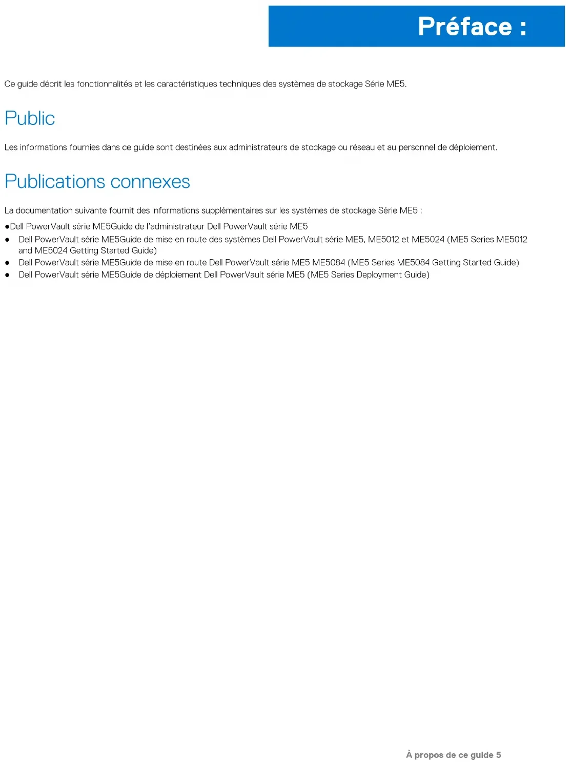 Table des matièresCe guide décrit les fonctionnalités et les caractéristiques techniques des systèmes de stockage Série ME5. Public Les informations fournies dans ce guide sont destinées aux administrateurs de stockage ou réseau et au personnel de déploiement. Publications connexes La documentation suivante fournit des informations supplémentaires sur les systèmes de stockage Série ME5 : ● Dell PowerVault série ME5Guide de l’administrateur Dell PowerVault série ME5 ● Dell PowerVault série ME5Guide de mise en route des systèmes Dell PowerVault série ME5, ME5012 et ME5024 (ME5 Series ME5012 and ME5024 Getting Started Guide) ● Dell PowerVault série ME5Guide de mise en route Dell PowerVault série ME5 ME5084 (ME5 Series ME5084 Getting Started Guide) ● Dell PowerVault série ME5Guide de déploiement Dell PowerVault série ME5 (ME5 Series Deployment Guide) Préface : À propos de ce guide 5Matériel du système de stockage Ce chapitre décrit les composants avant et arrière des boîtiers Série ME5. Certains des modules au sein du boîtier sont remplaçables sur site comme décrit dans Retrait et remplacement des modules. Les types de modules et autres composants qui peuvent être remplacés sont définis ci-dessous : ● CRU : Pièces remplaçables par le client ● FRU : Unités remplaçables sur site (experts en maintenance) Les termes CRU et FRU sont utilisés dans ce document. Ce document peut contenir du contenu tiers ne relevant pas de Dell. Le langage du contenu tiers peut ne pas respecter les consignes en vigueur concernant le contenu Dell. Dell se réserve le droit de mettre à jour ce document après la mise à jour du contenu par les tiers compétents. Sujets :