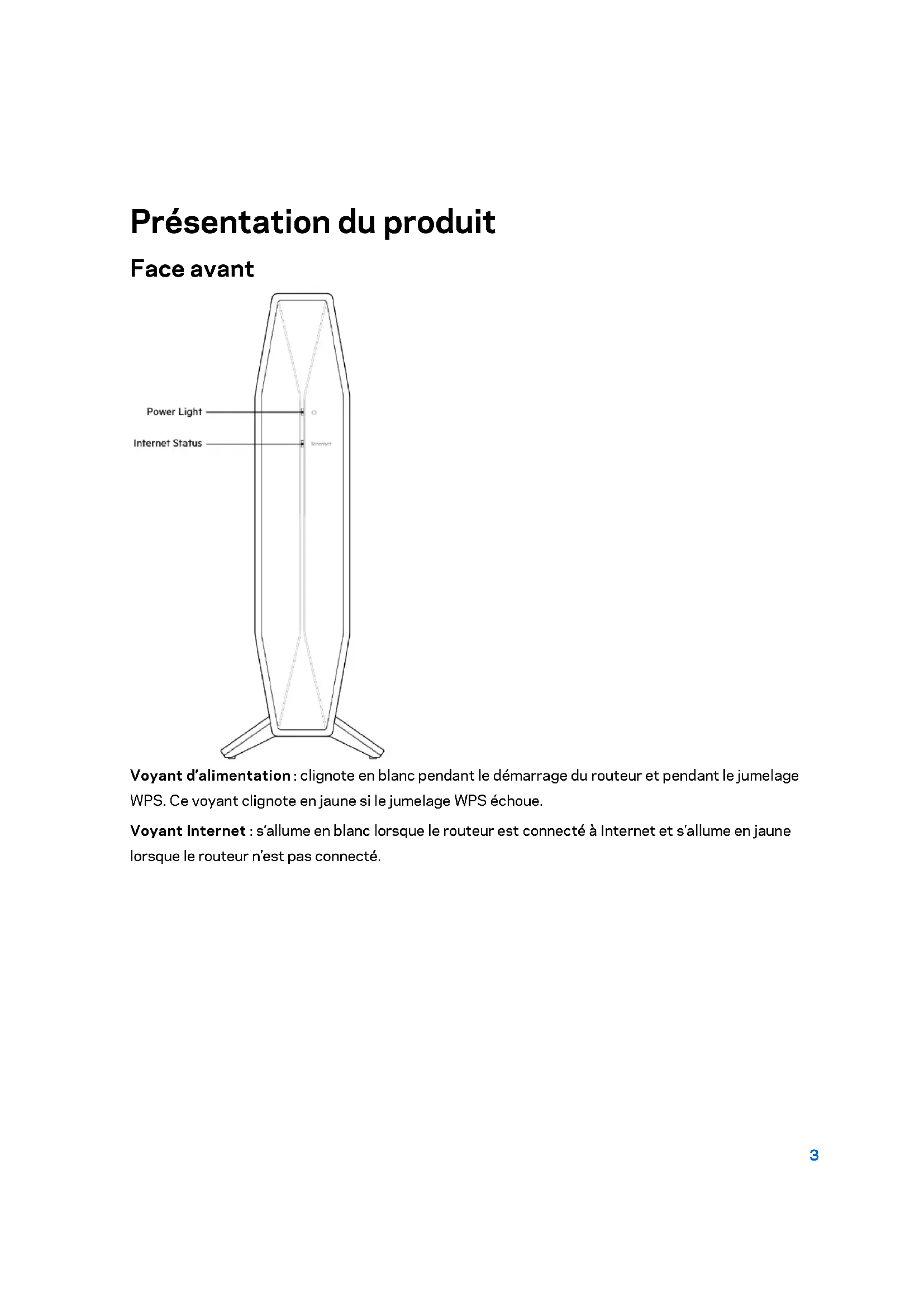 - Conditions environnementales Présentation du produit Face avant Voyant d’alimentation : clignote en blanc pendant le démarrage du routeur et pendant le jumelage WPS. Ce voyant clignote en jaune si le jumelage WPS échoue. Voyant Internet : s’allume en blanc lorsque le routeur est connecté à Internet et s’allume en jaune lorsque le routeur n’est pas connecté.4 Panneau arrière Bouton Wi-Fi Protected Setup™ (WPS) (1) : appuyez sur ce bouton pour configurer facilement la sécurité sans fil des périphériques réseau compatibles Wi-Fi Protected Setup. Le voyant se trouvant sous le bouton clignotera pendant que le jumelage WPS est actif. Bouton de réinitialisation (2) : pour restaurer les paramètres d'usine du routeur, maintenez ce bouton enfoncé jusqu'à ce que le voyant d'alimentation se mette à clignoter. Ports Ethernet (3) : raccordez les câbles Ethernet (également appelés câbles réseau) à ces ports Gigabit Ethernet (10 ou 100 ou 1000 Mbit/s), et aux périphériques Ethernet filaires de votre réseau. Les voyants se trouvant sous les ports s'allumeront uniquement dans le cas où un câble Ethernet est branché et des données sont transférés via ce câble. Port Internet (4) : utilisez un câble Ethernet pour brancher votre modem sur ce port. Le voyant se trouvant sous le port s'allumera uniquement dans le cas où un câble Ethernet est branché et des données sont transférés via ce câble. Port USB 3.0 (5) : connectez et partagez un disque USB sur votre réseau. Port d'alimentation (6) : branchez sur ce port l'adaptateur secteur fourni. Bouton d'alimentation (7) : appuyez sur | pour allumer (ON) le routeur.5 Installation : instructions de base Où trouver une aide supplémentaire En plus de ce guide utilisateur, vous trouverez d’autres documents d’assistance sur le site Belkin.com/support/ RT1800 (documentation, téléchargements, FAQ, support technique, chat en direct, forums). Remarque : Les licences et les notices relatives aux logiciels tiers utilisés dans ce produit sont disponibles à l'adresse suivante : https://www.belkin.com/support/license/ . Veuillez vous adressez à https://www.belkin.com/support/gplcodecenter/ pour toute demande de code source GPL. Comment installer votre routeur Vous souhaitez ajouter ce routeur à votre réseau Wi-Fi mesh existant ? Si vous avez déjà utilisé ce routeur, réinitialisez ses paramètres par défaut avant de l'ajouter à votre réseau Wi-Fi mesh. Pour ce faire il vous suffit de cliquer sur l'onglet Administration des paramètres de votre routeur ou d'appuyer et de maintenir enfoncé pendant 10 secondes le bouton de réinitialisation qui se trouve sur le panneau arrière du routeur. p. 223