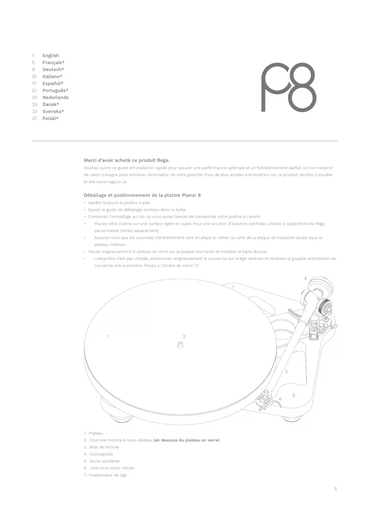 Merci d’avoir acheté ce produit Rega. Veuillez suivre ce guide d’installation rapide pour assurer une performance optimale et un fonctionnement parfait. Le non-respect de cette consigne peut entraîner l’annulation de votre garantie. Pour de plus amples informations sur ce produit, veuillez consulter le site www.rega.co.uk. Déballage et positionnement de la platine Planar 8