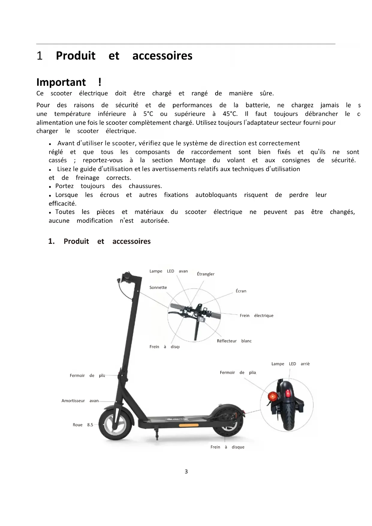 1 Produit et accessoires 3 2 Dépliage et pliage du scooter 5 3 Assemblage de l'appareil 6 4 Charge du scooter 7 5 Utilisation prévue 8 6 Consignes de sécurité 8 7 Entretien 9 8 Boutons de commande 12 9 Conduite du scooter électrique 13 10 Liste des paramètres 14 11 Garer le scooter électrique en toute sécurité 15 12 Transport en toute sécurité 15 13 Avertissements 15