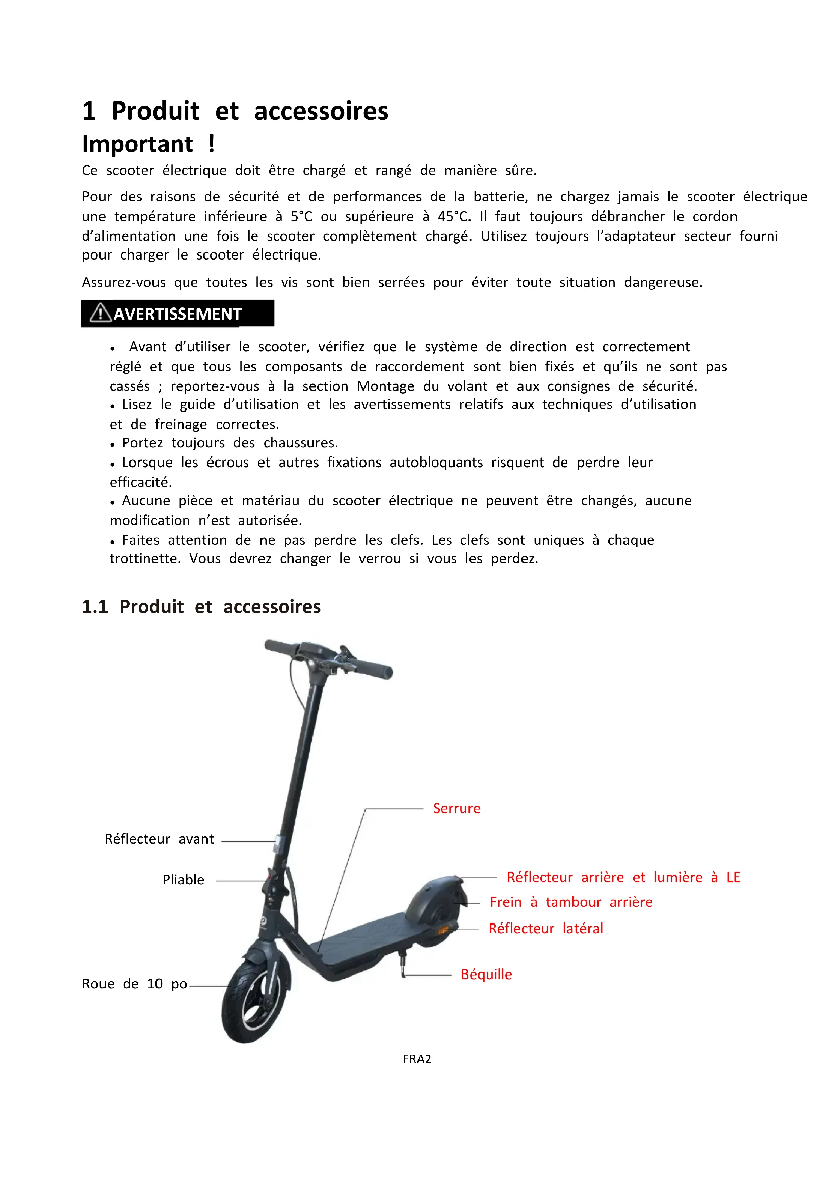 - 13 Avertissements FRA2 1 Produit et accessoires Important ! Ce scooter électrique doit être chargé et rangé de manière sûre. Pour des raisons de sécurité et de performances de la batterie, ne chargez jamais le scooter électrique à une température inférieure à 5°C ou supérieure à 45°C. Il faut toujours débrancher le cordon d’alimentation une fois le scooter complètement chargé. Utilisez toujours l’adaptateur secteur fourni pour charger le scooter électrique. Assurez-vous que toutes les vis sont bien serrées pour éviter toute situation dangereuse. AVERTISSEMENT p. 13