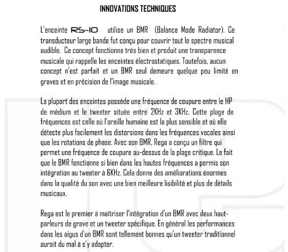 INNOVATIONS TECHNIQUES L’enceinte RS-10 utilise un BMR (Balance Mode Radiator). Ce transducteur large bande fut conçu pour couvrir tout le spectre musical audible. Ce concept fonctionne très bien et produit une transparence musicale qui rappelle les enceintes électrostatiques. Toutefois, aucun concept n’est parfait et un BMR seul demeure quelque peu limité en graves et en précision de l’image musicale. La plupart des enceintes possède une fréquence de coupure entre le HP de médium et le tweeter située entre 2KHz et 3KHz. Cette plage de fréquences est celle où l'oreille humaine est la plus sensible et où elle détecte plus facilement les distorsions dans les fréquences vocales ainsi que les rotations de phase. Avec son BMR, Rega a conçu un filtre qui permet une fréquence de coupure au-dessus de la plage critique. Le fait que le BMR fonctionne si bien dans les hautes fréquences a permis son intégration au tweeter à 6KHz. Cela donne des améliorations énormes dans la qualité du son avec une bien meilleure lisibilité et plus de détails musicaux. Rega est le premier à maîtriser l’intégration d’un BMR avec deux haut- parleurs de grave et un tweeter spécifique. En général les performances dans les aigus d’un BMR sont tellement bonnes qu’un tweeter traditionnel aurait du mal à s’y adapter.2 C’est pourquoi Rega a décidé de mettre au point un tweeter tout neuf. Celui-ci utilise la technologie ZRR (Zero Rear Reflection) déjà employée dans la série d’enceintes RS. Pour la RS-10, Rega pousse la technologie plus loin en l’appliquant à un tweeter en aluminium dont le dôme en soie est monté directement sur la plaque avant, éliminant ainsi une source majeure de vibrations. Chaque tweeter est méticuleusement monté à la main à l’usine Rega en Angleterre et incorpore une bague de Faraday en cuivre qui élargit la bande passante jusqu’à 23KHz en réduisant l’inductance de la bobine. Pour les graves, la RS-10 fait appel à deux HP en parallèle. Ces HP ont de tailles différentes, ont des fréquences de résonance différentes, et des systèmes de charge différents. Un HP de 200mm à membrane léger en papier, une bobine à 8 couches et une fréquence de résonance de 40Hz est monté latéralement et fonctionne avec une ligne de transmission dont l’évent étend la réponse dans les graves en dessous du spèctre audible. Il est couplé avec un transducteur de 125mm, également à membrane en papier et bobine à 8 couches, d’une fréquence de résonance de 75Hz. Ce dernier fonctionne en charge close grâce à un petit compartiment scellé.Ce système élimine la traditionnelle résonance unique des graves en distribuant les résonances moins importantes à travers toute la bande des graves et permet un certain “auto amortissement” dû à la connexion en parallèle avec l’ampli. Ceci permet des graves plus musicaux, linéaires et mieux tenus et qui peuvent être ajustés en fonction de la pièce. POSITIONNEMENT Les enceintes RS-10 utilisent chacune deux HP de grave ainsi qu'un évent, tous trois montés latéralement. Le positionnement – avec les HP latéraux dirigés vers l'intérieur ou vers l'extérieur – est une affaire de goût personnel et des caractéristiques de la pièce. En général, les HP latéraux dirigés vers l'extérieur donneront une scène sonore plus large, alors que les HP latéraux dirigés vers l'intérieur favoriseront une image musicale plus précise. Il n'y a pas de règle stricte quant au placement des enceintes: l'expérimentation est le meilleur moyen de trouver le placement idéal. 3OPTIMISATION Vous pouvez intervenir pour adapter les enceintes en fonction de votre pièce d’écoute en modifiant l’équilibre entre les hautes et les basses fréquences. Nous recommandons de commencer avec la fiche dans la prise du milieu (n°2). Si la musique vous semble un peu lourde dans les graves, essayez la prise n°1 et/ou éloignez l’enceinte du mur. Si la musique vous semble trop légère dans les graves, passez à la prise n°3 et/ou rapprochez l’enceinte du mur. Ces ajustements ont un effet très subtil et servent à optimiser le rendu des enceintes. La “bonne” configuration est une affaire de goût personnel. Attendez-vous à entendre de la musique “juste” plutôt qu’à un changement dramatique dans les graves.