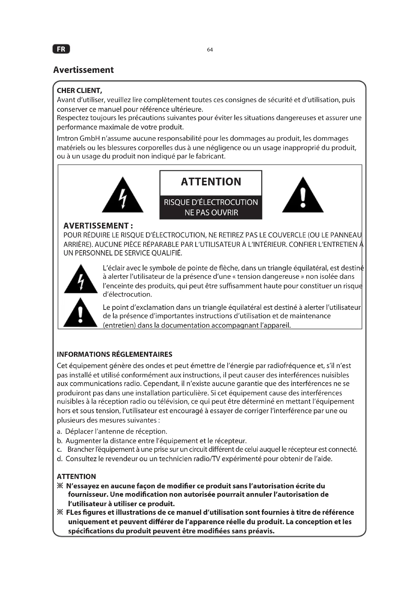 CHER CLIENT, Avant d’utiliser, veuillez lire complètement toutes ces consignes de sécurité et d’utilisation, puis conserver ce manuel pour référence ultérieure. Respectez toujours les précautions suivantes pour éviter les situations dangereuses et assurer une performance maximale de votre produit. Imtron GmbH n’assume aucune responsabilité pour les dommages au produit, les dommages matériels ou les blessures corporelles dus à une négligence ou un usage inapproprié du produit, ou à un usage du produit non indiqué par le fabricant. Avertissement