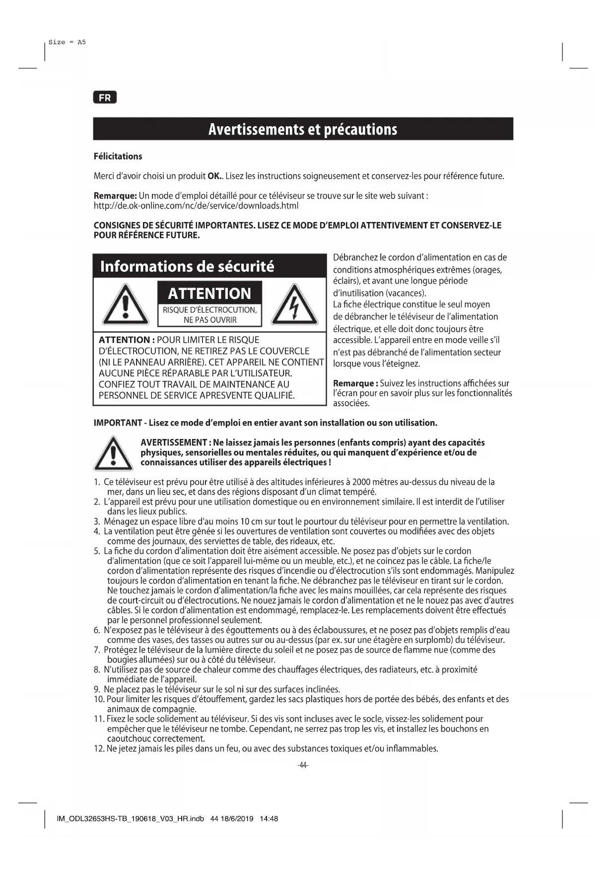 Avertissements et précautions Félicitations Merci d’avoir choisi un produit OK.. Lisez les instructions soigneusement et conservez-les pour référence future. Remarque: Un mode d’emploi détaillé pour ce téléviseur se trouve sur le site web suivant : http://de.ok-online.com/nc/de/service/downloads.html CONSIGNES DE SÉCURITÉ IMPORTANTES. LISEZ CE MODE D’EMPLOI ATTENTIVEMENT ET CONSERVEZ-LE POUR RÉFÉRENCE FUTURE. Informations de sécurité ATTENTION RISQUE D’ÉLECTROCUTION,