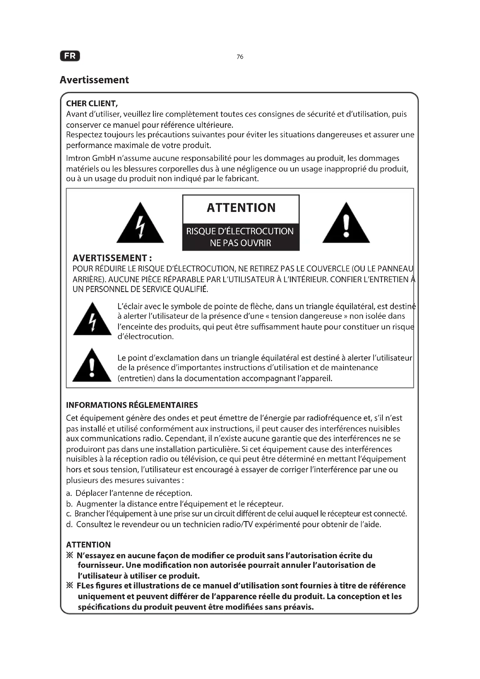 CHER CLIENT, Avant d’utiliser, veuillez lire complètement toutes ces consignes de sécurité et d’utilisation, puis conserver ce manuel pour référence ultérieure. Respectez toujours les précautions suivantes pour éviter les situations dangereuses et assurer une performance maximale de votre produit. Imtron GmbH n’assume aucune responsabilité pour les dommages au produit, les dommages matériels ou les blessures corporelles dus à une négligence ou un usage inapproprié du produit, ou à un usage du produit non indiqué par le fabricant. Avertissement
