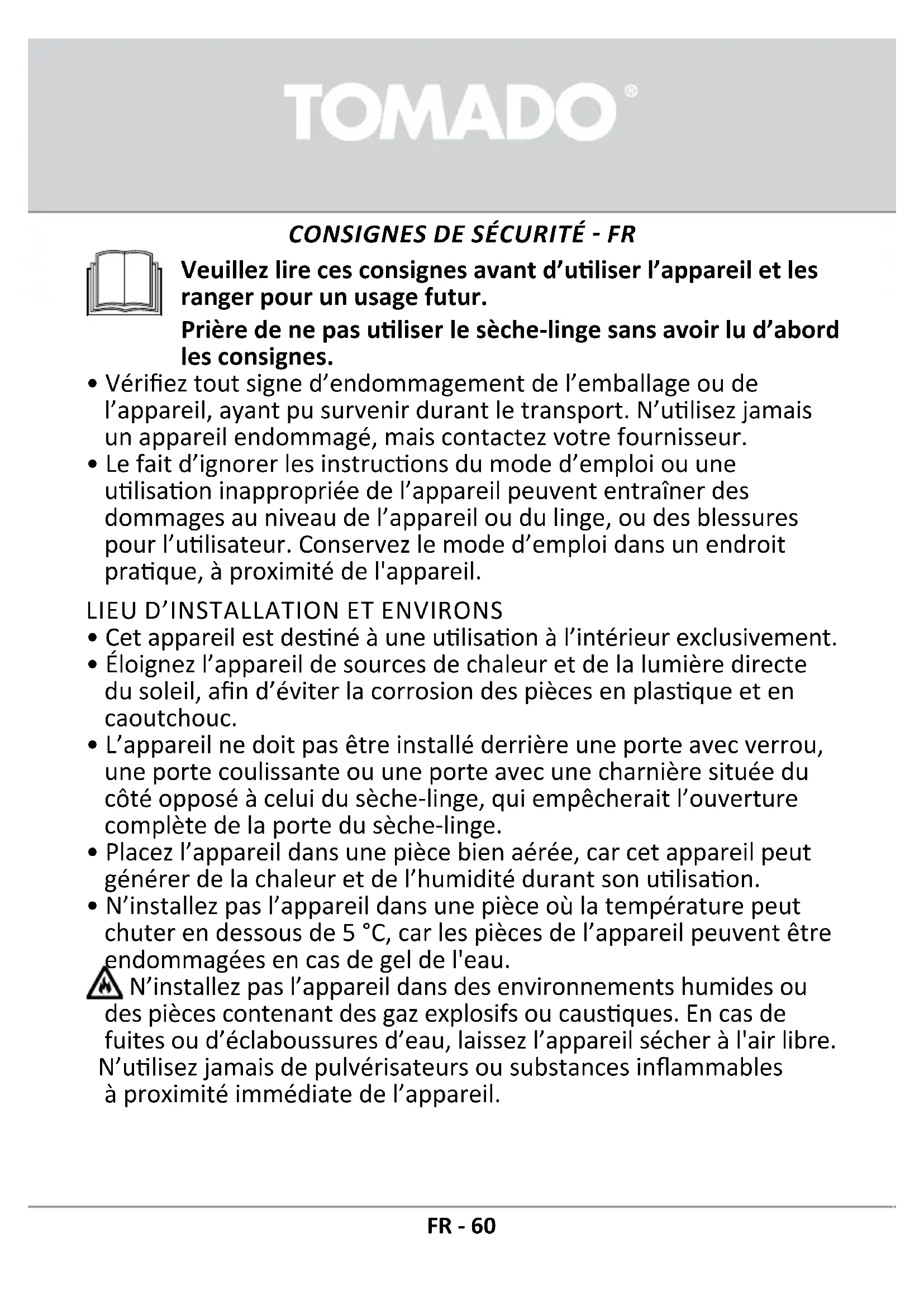 Utilisez l'appareil uniquement pour le séchage du linge tel que décrit dans le mode d'emploi. La machine n'est pas prévue pour le nettoyage à sec. - Utilisez uniquement des produits conçus spécifiquement pour le séchage du linge. Tomado ne sera pas responsable de tout dommage ou décoloration de joints et pièces en plastique résultant d'une utilisation incorrecte d'agents de blanchiment ou colorants. - En cas de défaut, utilisez uniquement des pièces de rechange approuvées, en provenance de fabricants autorisés. - Assurez-vous que toutes les poches des vêtements sont vides. Les articles pointus et rigides tels que les pièces de monnaie, broches, clous, vis, pierres, etc., peuvent gravement endommager cette machine. - Retirez tous les objets des poches des vêtements, comme les briquets et allumettes, avant d'utiliser l'appareil. - Les assouplissants ou produits similaires doivent être utilisés tel que recommandé dans leurs modes d'emploi. - Veuillez ne pas fermer la porte avec une force excessive. Si vous avez des difficultés à fermer la porte, veuillez contrôler si les vêtements sont insérés et répartis correctement. - En cas de branchement incorrect de l'appareil, d'utilisation incorrecte ou d'entretien par une personne non autorisée, l'utilisateur supportera les coûts liés à tout dommage occasionné, car un tel dommage ne sera pas couvert par la garantie.
