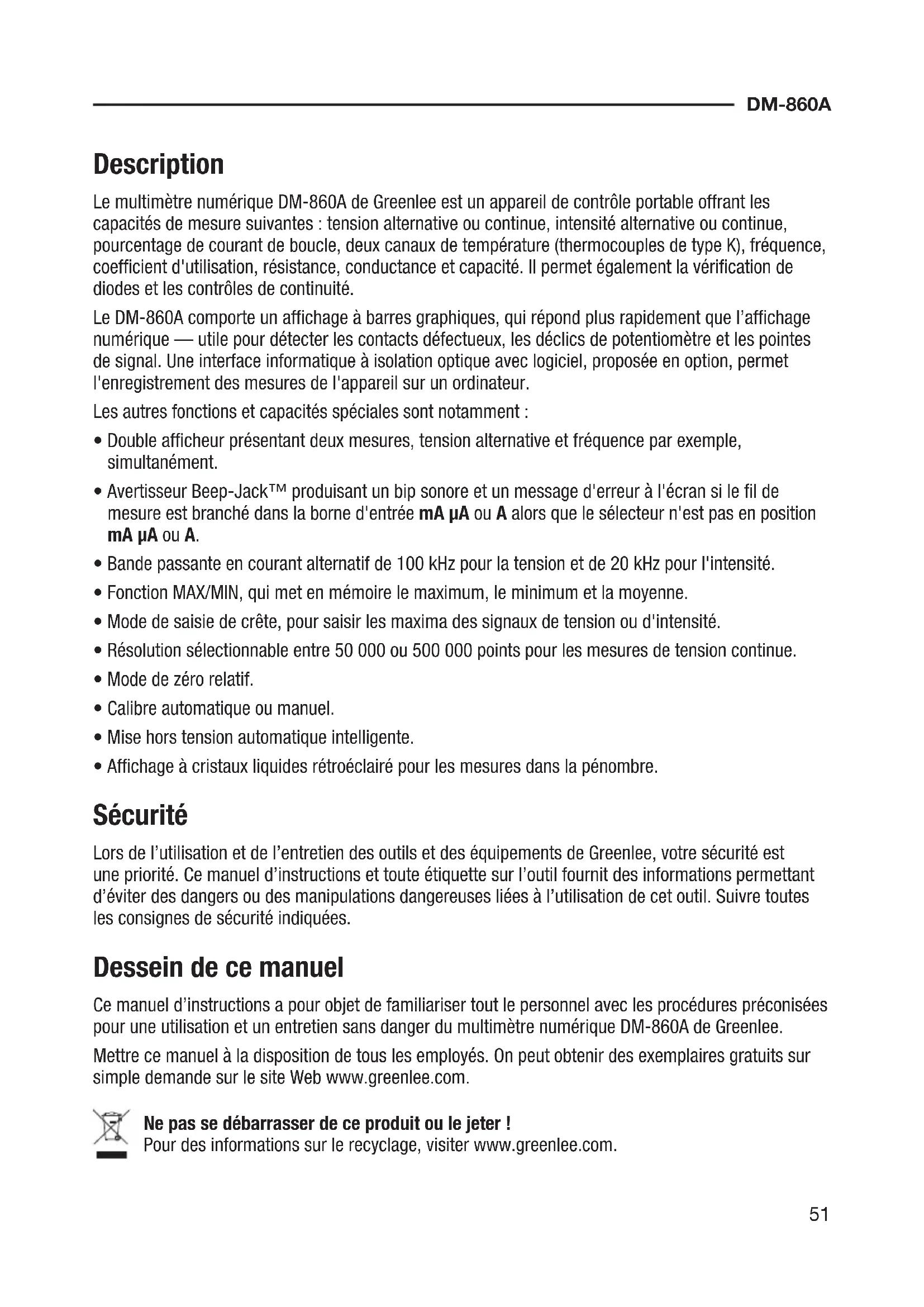 - Affichage à cristaux liquides rétroéclairé pour les mesures dans la pénombre. Sécurité Lors de l’utilisation et de l’entretien des outils et des équipements de Greenlee, votre sécurité est une priorité. Ce manuel d’instructions et toute étiquette sur l’outil fournit des informations permettant d’éviter des dangers ou des manipulations dangereuses liées à l’utilisation de cet outil. Suivre toutes les consignes de sécurité indiquées. Dessein de ce manuel Ce manuel d’instructions a pour objet de familiariser tout le personnel avec les procédures préconisées pour une utilisation et un entretien sans danger du multimètre numérique DM-860A de Greenlee. Mettre ce manuel à la disposition de tous les employés. On peut obtenir des exemplaires gratuits sur simple demande sur le site Web www.greenlee.com. Ne pas se débarrasser de ce produit ou le jeter ! Pour des informations sur le recyclage, visiter www.greenlee.com.52