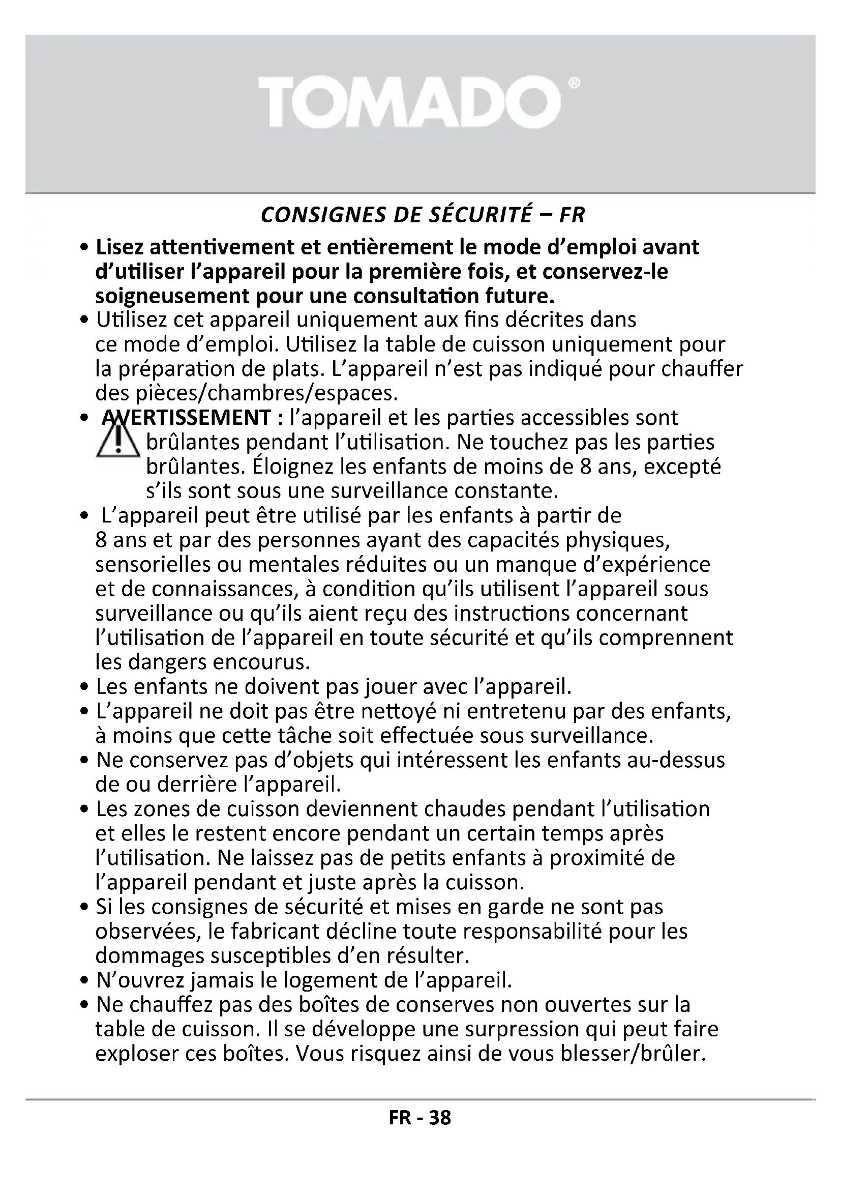FR - 38• AVERTISSEMENT : risque d’incendie : ne rien laisser sur la table de cuisson.
