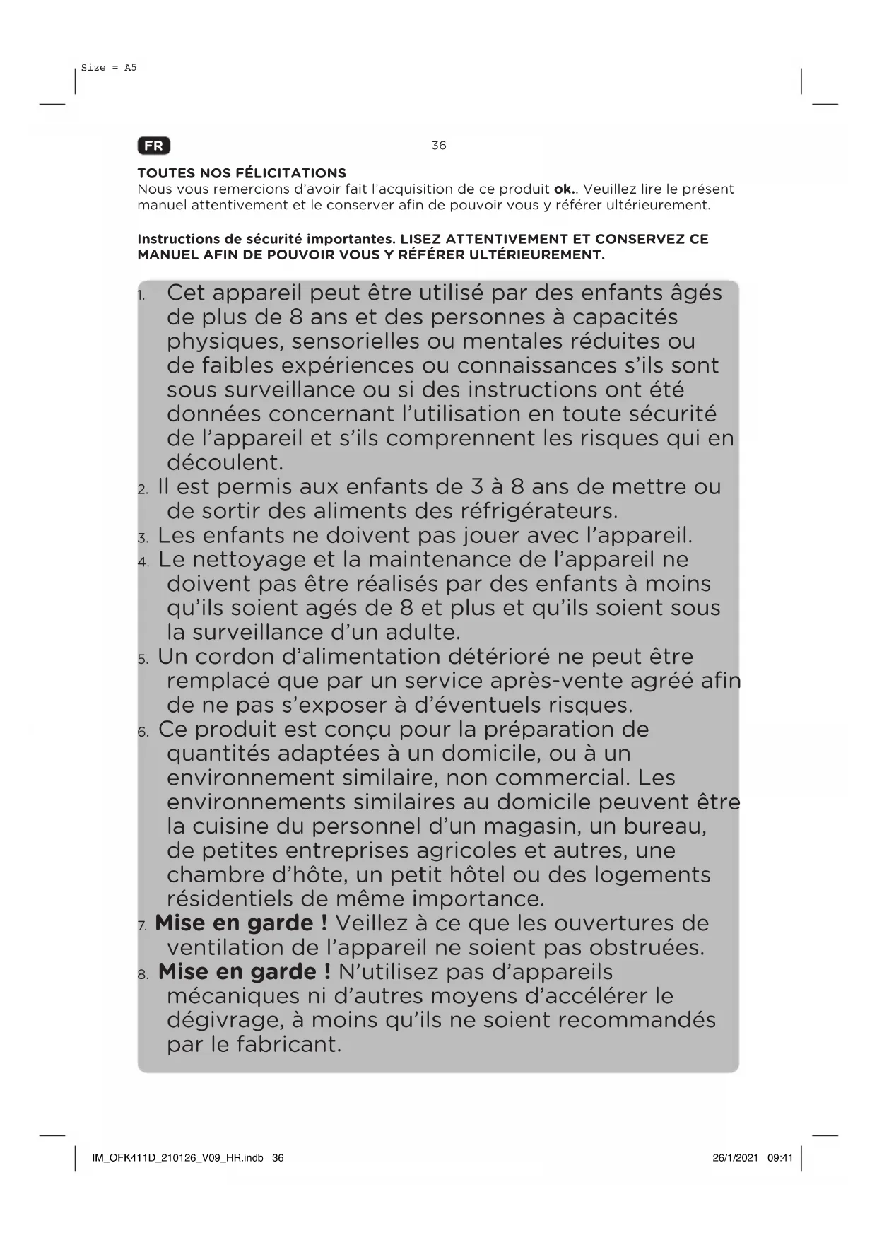 mécaniques ni d’autres moyens d’accélérer le dégivrage, à moins qu’ils ne soient recommandés par le fabricant. IM_OFK411D_210126_V09_HR.indb 36IM_OFK411D_210126_V09_HR.indb 36 26/1/2021 09:4126/1/2021 09:4137