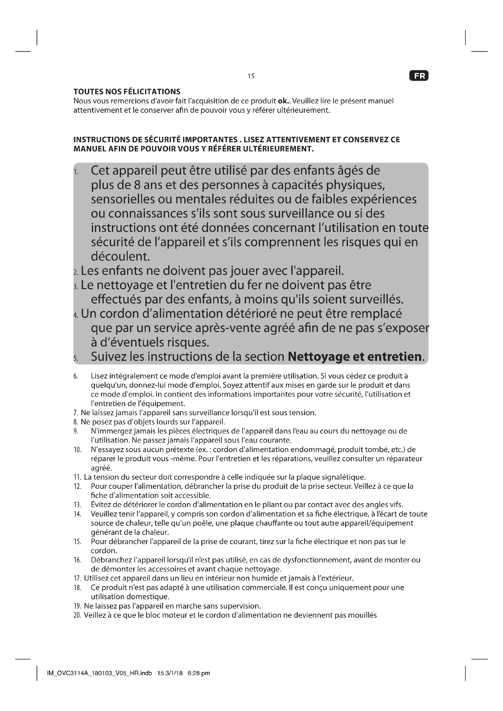 J. Buse à sol K. Câble d'alimentation avec prise (câble rétractable) L. Roue M. Buse à canapé avec buse de recoins intégrée N. Bouton de retrait du cache du bac à poussière O. Réceptacle du sac à poussière P. Cache du bac à poussière Q. Raccord du tuyau d'aspiration R. Poignée de transport S. Indicateur de niveau de remplissage T. Capot d'entrée d'air auxiliaire U. Poignée du tube d'aspiration inclus 1 sac à poussière en microbres (non illustré) AVANT DE L’UTILISER POUR LA PREMIERE FOIS Retirez soigneusement le produit et les accessoires de leur emballage d’origine. Il est conseillé de conserver l’emballage d’origine pour le rangement. Si vous souhaitez disposer de l’emballage d’origine, veuillez respecter les recommandations légales en vigueur. Si vous avez des questions concernant le rebut approprié, contactez le service de déchetterie local. Vériez que le contenu est complet et qu'il n'est pas endommagé. Si le contenu livré est incomplet ou endommagé, contactez immédiatement votre revendeur. Après avoir déballé, veuillez consulter la section Nettoyage et entretien. IM_OVC3114A_180103_V05_HR.indb 16 3/1/18 6:28 pm17