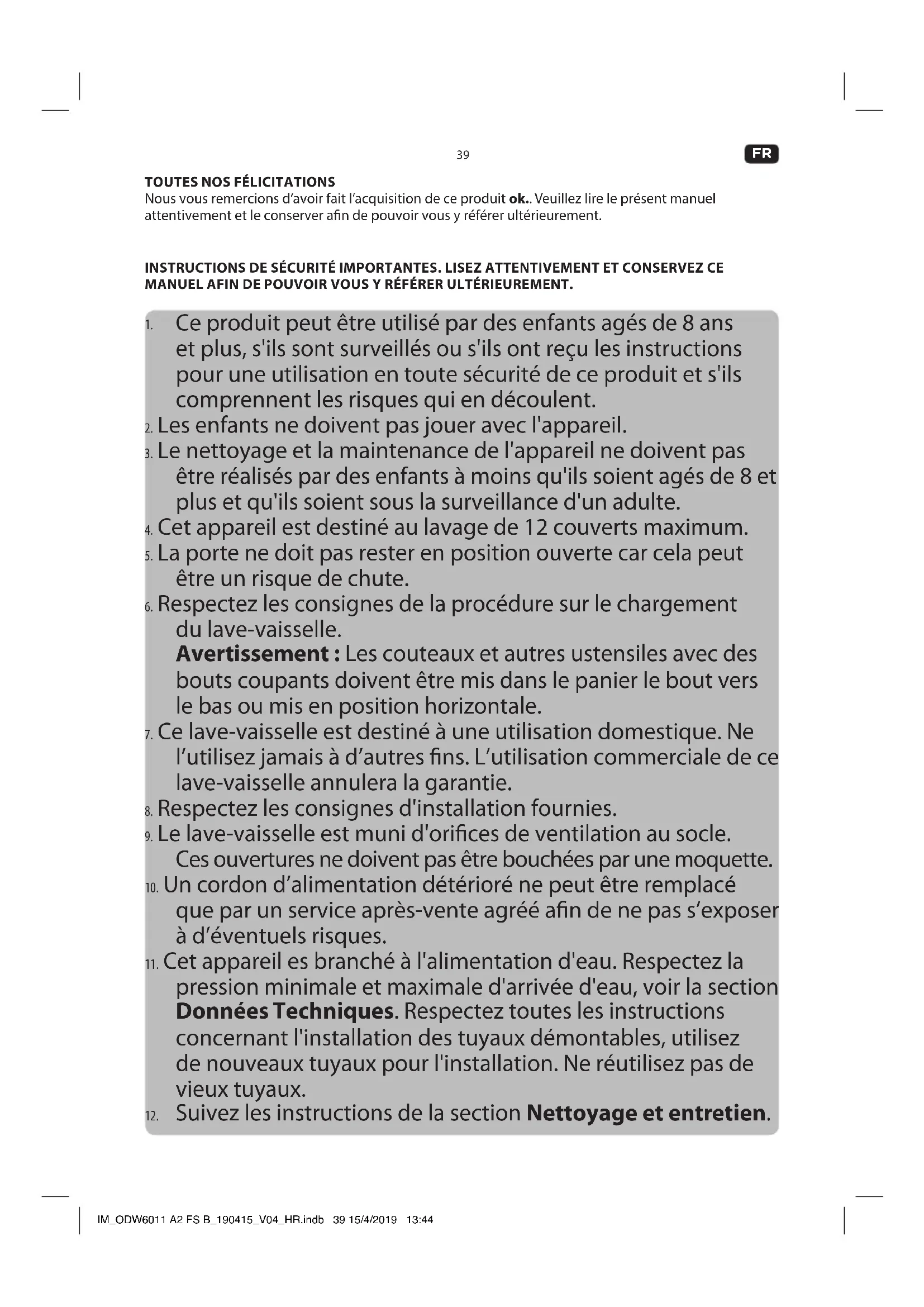 - Après avoir déballé, veuillez consulter la section Nettoyage et entretien. IM_ODW6011 A2 FS B_190415_V04_HR.indb 41 15/4/2019 13:4442 Size = A5
