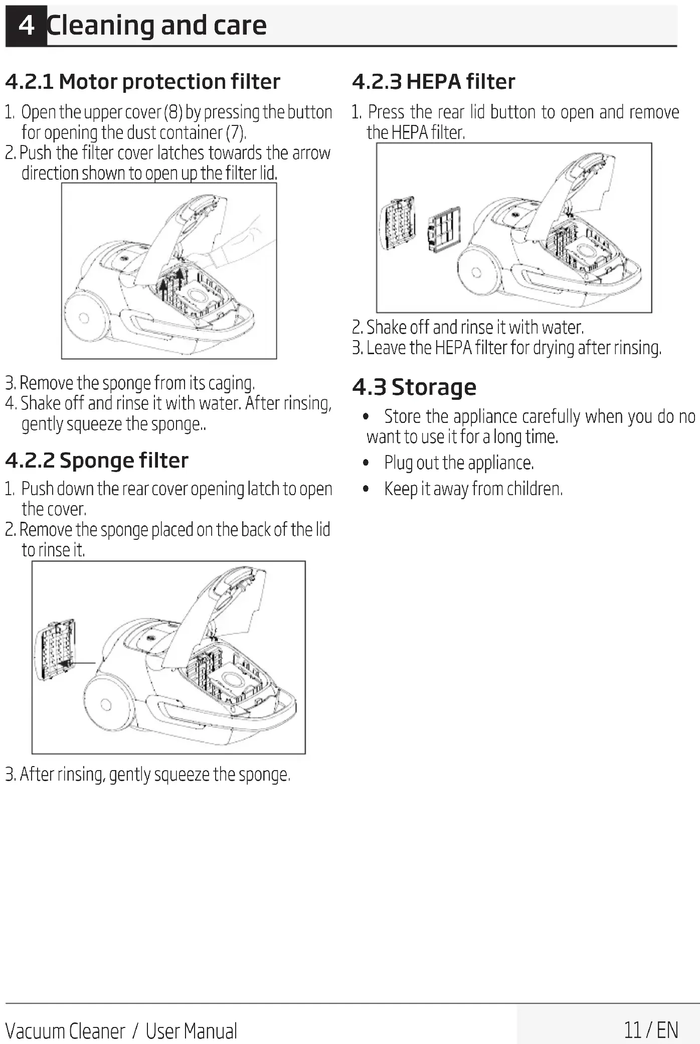 moteur 1. Ouvrez le couvercle supérieur (8) en appuyant sur le bouton d’ouverture du récipient à poussière (7).2. Poussez les loquets du couvercle du filtre dans la direction indiquée par la flèche pour ouvrir le couvercle du filtre.3. Retirez le filtre éponge de son habitacle.4. Secouez et rincez à l’eau Après le rinçage, pincez légèrement le filtre éponge.