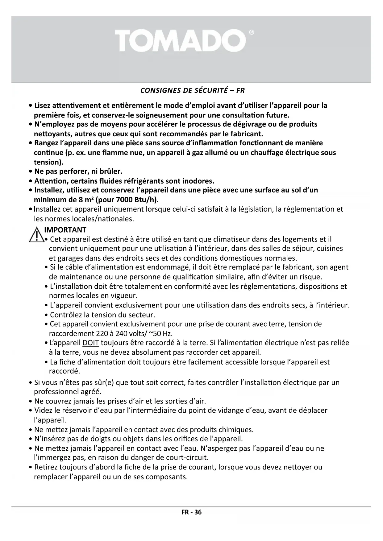 FR - 36• Ne raccordez JAMAIS l’appareil à l’aide d’une rallonge électrique. Si une prise de courant appropriée avec prise de terre n’est pas disponible, faites-en installer une par un électricien agréé.