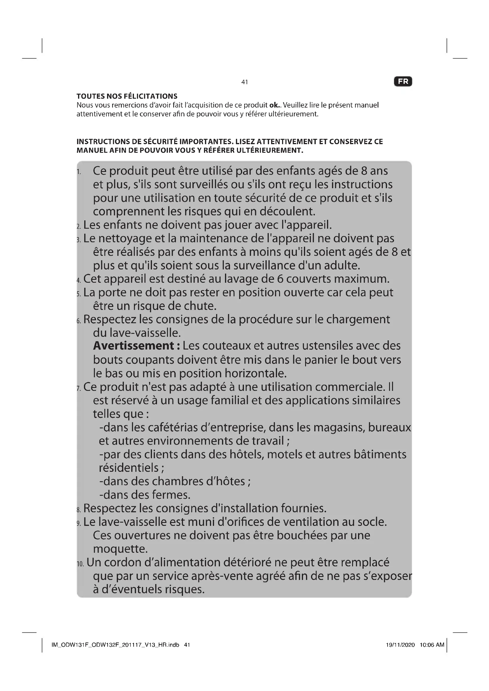 La période de garantie du produit, ainsi que les conditions en vigueur de la garantie se trouvent sur la carte de garantie fournie avec le produit. Les pièces de rechange, gurant dans la directive sur l'écoconception correspondante, sont disponibles en contactant le centre de service à la clientèle, pour une période d'au moins 7 ans, ou 10 ans respectivement. IM_ODW131F_ODW132F_201117_V13_HR.indb 42IM_ODW131F_ODW132F_201117_V13_HR.indb 42 19/11/2020 10:06 AM19/11/2020 10:06 AM43