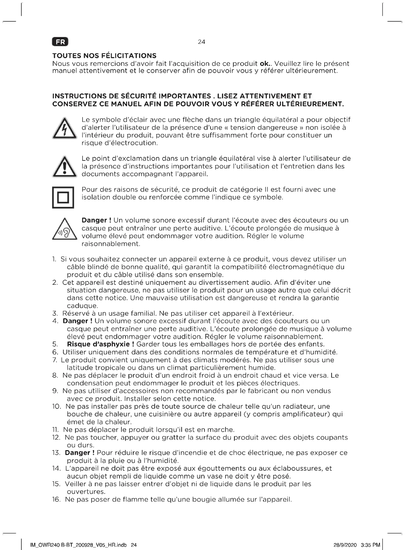 Ne jetez pas cet appareil aux ordures ménagères. Rapportez-le dans un centre de collecte adapté au recyclage des équipements électriques et électroniques. Pour plus d’informations, contactez votre détaillant ou les autorités locales. Jetez les piles en respectant l’environnement. Ne jetez pas les piles dans les ordures ménagères. Rapportezles dans un centre de collecte local ou contactez le revendeur où vous avez acheté ce produit. IM_OWR240 B-BT_200928_V05_HR.indb 30IM_OWR240 B-BT_200928_V05_HR.indb 30 28/9/2020 3:35 PM28/9/2020 3:35 PMGR