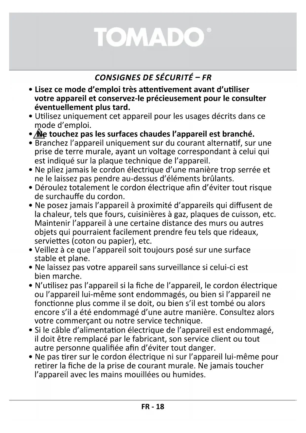 Ce produit est garan pour une période de 24 mois. Votre garane est valable lorsque le produit est ulisé conformément au mode d'emploi et pour l'usage auquel il est desné. Par ailleurs, la preuve d'achat originale doit être fournie, en portant menon de la date d'achat, du nom du détaillant ainsi que du numéro d'arcle du produit. Pour connaître les condions de garane détaillées, rendez-vous sur notre site Internet : www.tomado.com/support