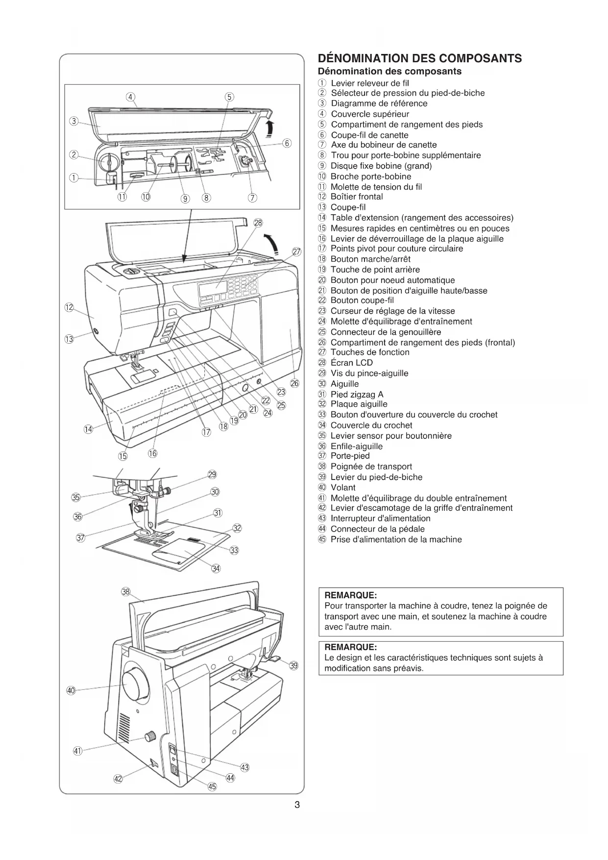 Dénomination des composants q Levier releveur de l w Sélecteur de pression du pied-de-biche e Diagramme de référence r Couvercle supérieur t Compartiment de rangement des pieds y Coupe-l de canette u Axe du bobineur de canette i Trou pour porte-bobine supplémentaire o Disque xe bobine (grand) !0 Broche porte-bobine !1 Molette de tension du l !2 Boîtier frontal !3 Coupe-l !4 Table d'extension (rangement des accessoires) !5 Mesures rapides en centimètres ou en pouces !6 Levier de déverrouillage de la plaque aiguille !7 Points pivot pour couture circulaire !8 Bouton marche/arrêt !9 Touche de point arrière @0 Bouton pour noeud automatique @1 Bouton de position d'aiguille haute/basse @2 Bouton coupe-l @3 Curseur de réglage de la vitesse @4 Molette d'équilibrage d'entraînement @5 Connecteur de la genouillère @6 Compartiment de rangement des pieds (frontal) @7 Touches de fonction @8 Écran LCD @9 Vis du pince-aiguille #0 Aiguille #1 Pied zigzag A #2 Plaque aiguille #3 Bouton d'ouverture du couvercle du crochet #4 Couvercle du crochet #5 Levier sensor pour boutonnière #6 Enle-aiguille #7 Porte-pied #8 Poignée de transport #9 Levier du pied-de-biche $0 Volant $1 Molette d’équilibrage du double entraînement $2 Levier d'escamotage de la griffe d'entraînement $3 Interrupteur d'alimentation $4 Connecteur de la pédale $5 Prise d'alimentation de la machine REMARQUE: Pour transporter la machine à coudre, tenez la poignée de transport avec une main, et soutenez la machine à coudre avec l'autre main.4 q w e r t y u i o