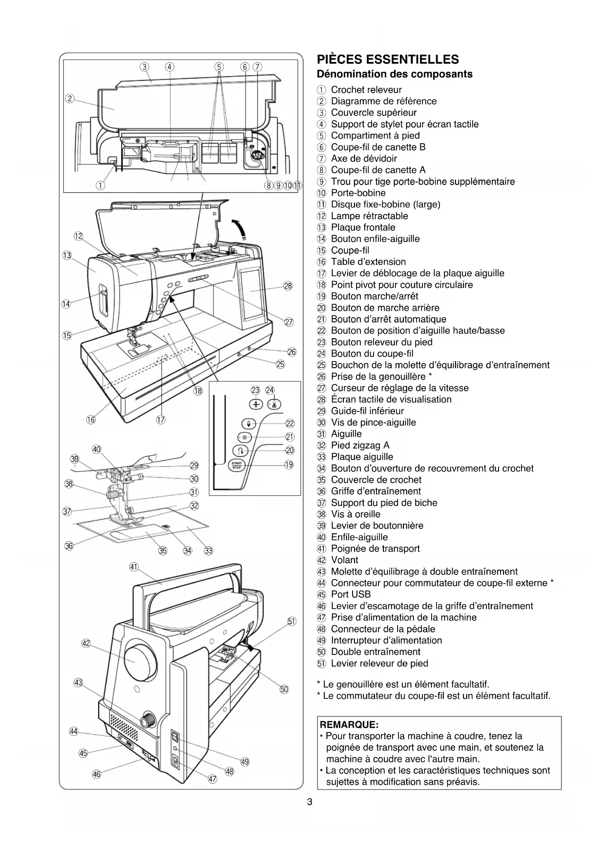 Crochet releveur Diagramme de référence Couvercle supérieur Support de stylet pour écran tactile Compartiment à pied Coupe-l de canette B Axe de dévidoir Coupe-l de canette A Trou pour tige porte-bobine supplémentaire Porte-bobine Disque xe-bobine (large) Lampe rétractable Plaque frontale Bouton enle-aiguille Coupe-l Table d’extension Levier de déblocage de la plaque aiguille Point pivot pour couture circulaire Bouton marche/arrêt Bouton de marche arrière Bouton d’arrêt automatique Bouton de position d’aiguille haute/basse Bouton releveur du pied Bouton du coupe-l Bouchon de la molette d’équilibrage d’entraînement Prise de la genouillère * Curseur de réglage de la vitesse Écran tactile de visualisation Guide-l inférieur Vis de pince-aiguille Aiguille Pied zigzag A Plaque aiguille Bouton d’ouverture de recouvrement du crochet Couvercle de crochet Griffe d’entraînement Support du pied de biche Vis à oreille Levier de boutonnière Enle-aiguille Poignée de transport Volant Molette d’équilibrage à double entraînement Connecteur pour commutateur de coupe-l externe * Port USB Levier d’escamotage de la griffe d’entraînement Prise d’alimentation de la machine Connecteur de la pédale Interrupteur d’alimentation Double entraînement Levier releveur de pied REMARQUE: