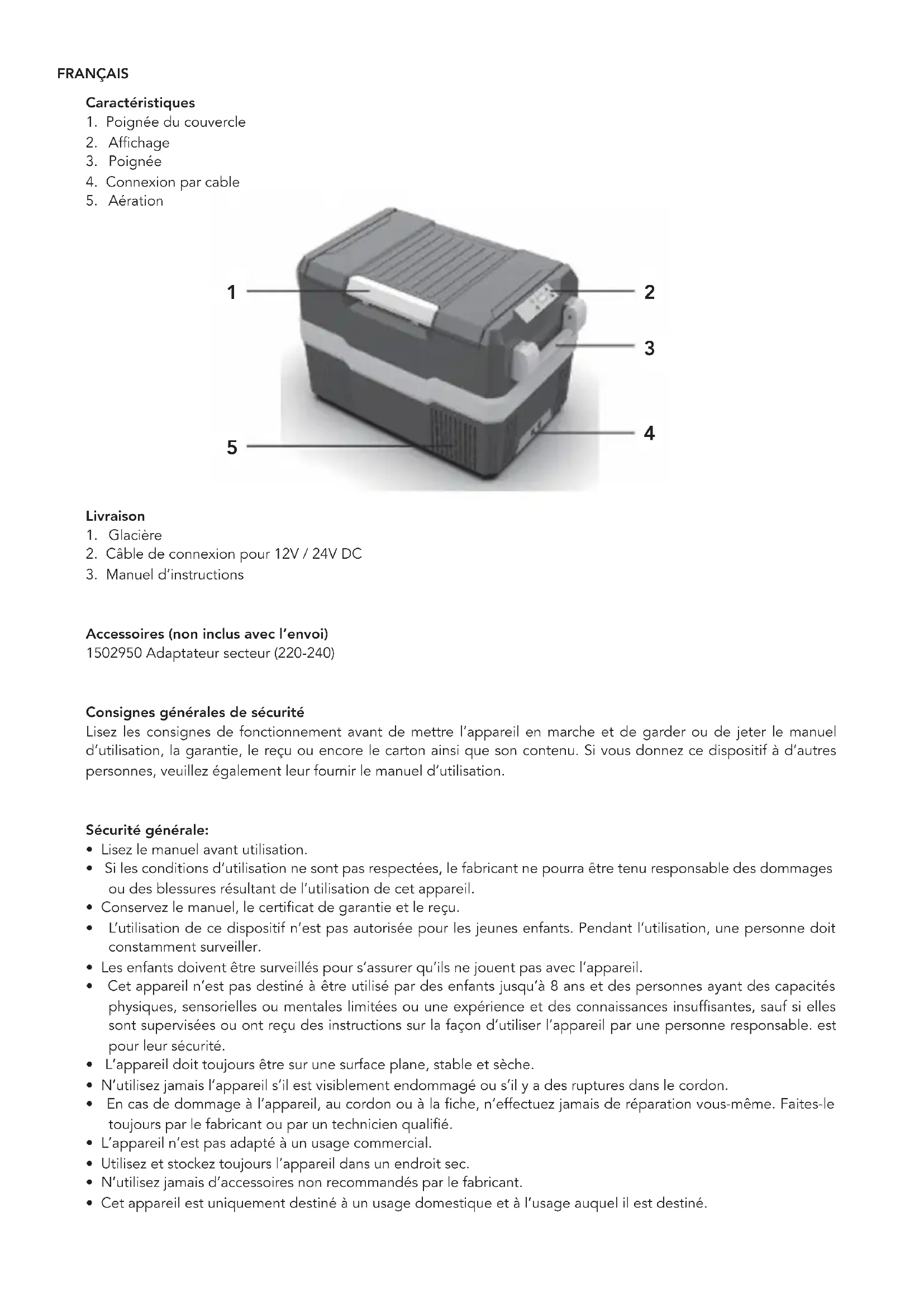 Accessoires (non inclus avec l’envoi) 1502950 Adaptateur secteur (220-240) Consignes générales de sécurité Lisez les consignes de fonctionnement avant de mettre l’appareil en marche et de garder ou de jeter le manuel d’utilisation, la garantie, le reçu ou encore le carton ainsi que son contenu. Si vous donnez ce dispositif à d’autres personnes, veuillez également leur fournir le manuel d’utilisation. Sécurité générale: