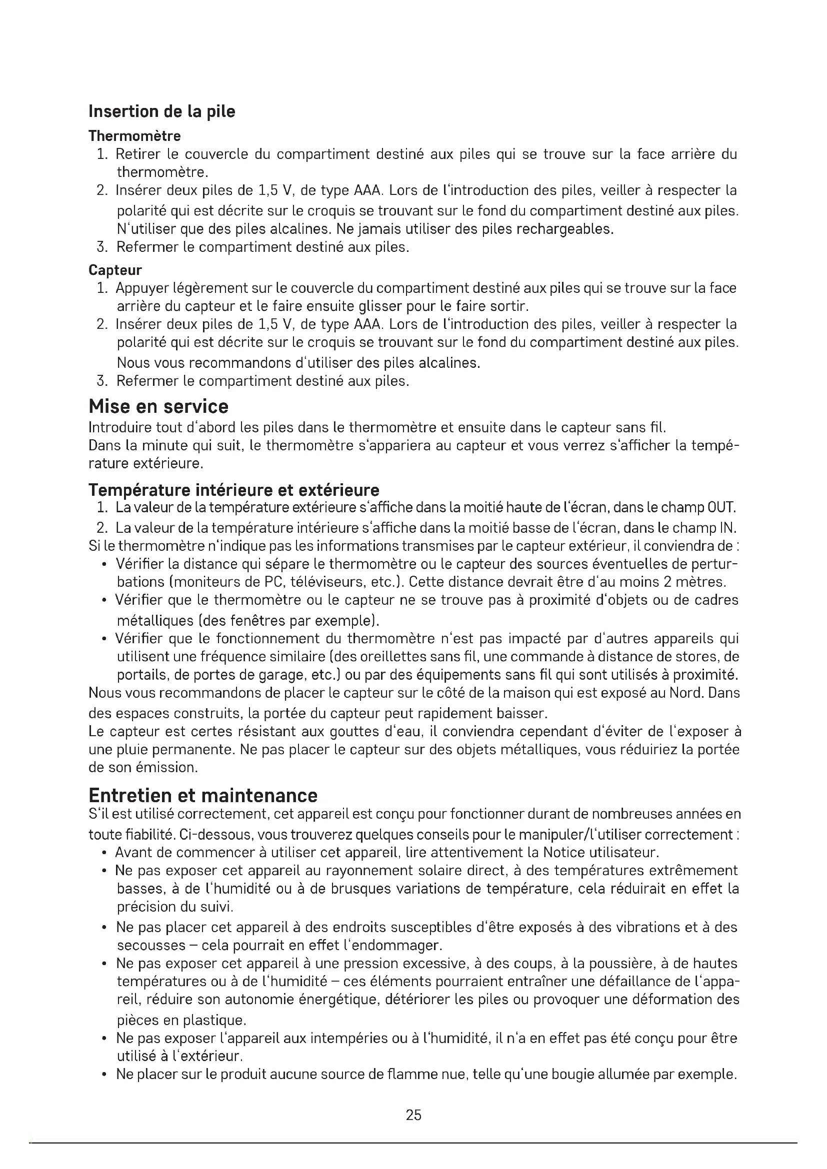 - Vérier que le fonctionnement du thermomètre n‘est pas impacté par d‘autres appareils qui utilisent une fréquence similaire (des oreillettes sans l, une commande à distance de stores, de portails, de portes de garage, etc.) ou par des équipements sans l qui sont utilisés à proximité. Nous vous recommandons de placer le capteur sur le côté de la maison qui est exposé au Nord. Dans des espaces construits, la portée du capteur peut rapidement baisser. Le capteur est certes résistant aux gouttes d‘eau, il conviendra cependant d‘éviter de l‘exposer à une pluie permanente. Ne pas placer le capteur sur des objets métalliques, vous réduiriez la portée de son émission. Entretien et maintenance S‘il est utilisé correctement, cet appareil est conçu pour fonctionner durant de nombreuses années en toute abilité. Ci-dessous, vous trouverez quelques conseils pour le manipuler/l‘utiliser correctement :