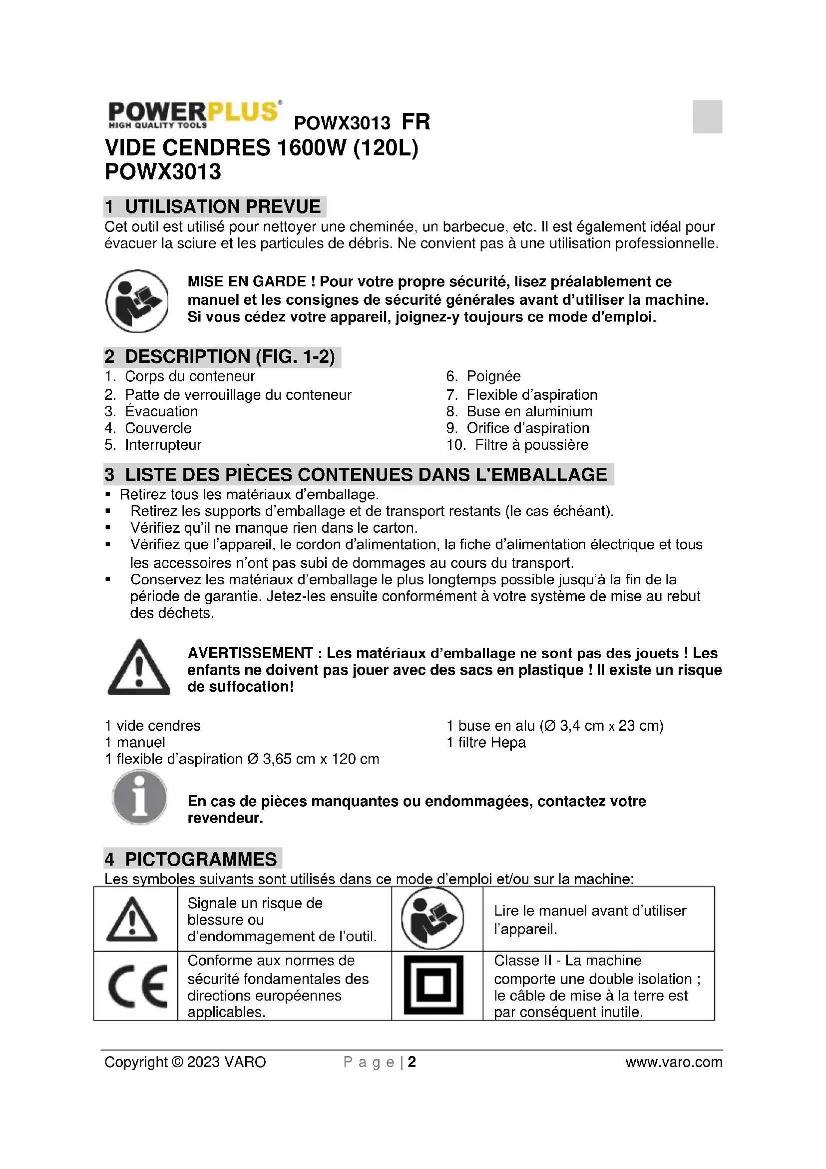 Copyright © 2023 VARO P a g e | 2 www.varo.com VIDE CENDRES 1600W (120L) POWX3013 1 UTILISATION PREVUE Cet outil est utilisé pour nettoyer une cheminée, un barbecue, etc. Il est également idéal pour évacuer la sciure et les particules de débris. Ne convient pas à une utilisation professionnelle. MISE EN GARDE ! Pour votre propre sécurité, lisez préalablement ce manuel et les consignes de sécurité générales avant d’utiliser la machine. Si vous cédez votre appareil, joignez-y toujours ce mode d'emploi. 2 DESCRIPTION (FIG. 1-2)