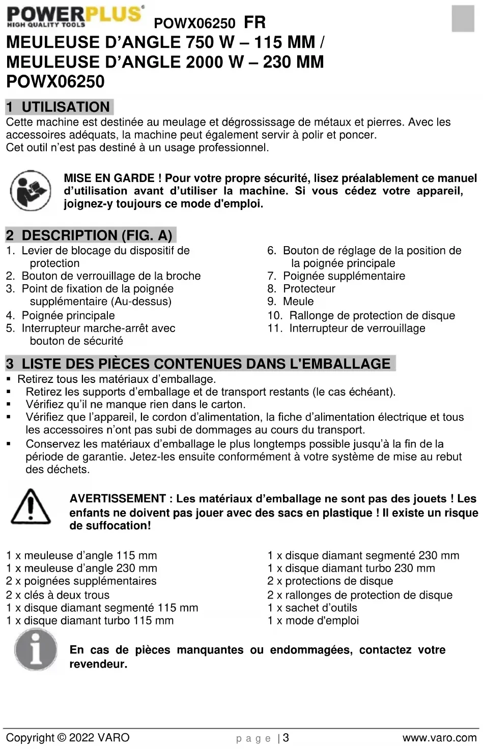 enfants ne doivent pas jouer avec des sacs en plastique ! Il existe un risque de suffocation! 1 x meuleuse d’angle 115 mm 1 x meuleuse d’angle 230 mm 2 x poignées supplémentaires 2 x clés à deux trous 1 x disque diamant segmenté 115 mm 1 x disque diamant turbo 115 mm 1 x disque diamant segmenté 230 mm 1 x disque diamant turbo 230 mm 2 x protections de disque 2 x rallonges de protection de disque 1 x sachet d’outils 1 x mode d'emploi En cas de pièces manquantes ou endommagées, contactez votre revendeur.POWX06250 FR Copyright © 2022 VARO p a g e | 4 www.varo.com 4 PICTOGRAMMES Les symboles suivants sont utilisés dans ce mode d’emploi et/ou sur la machine :