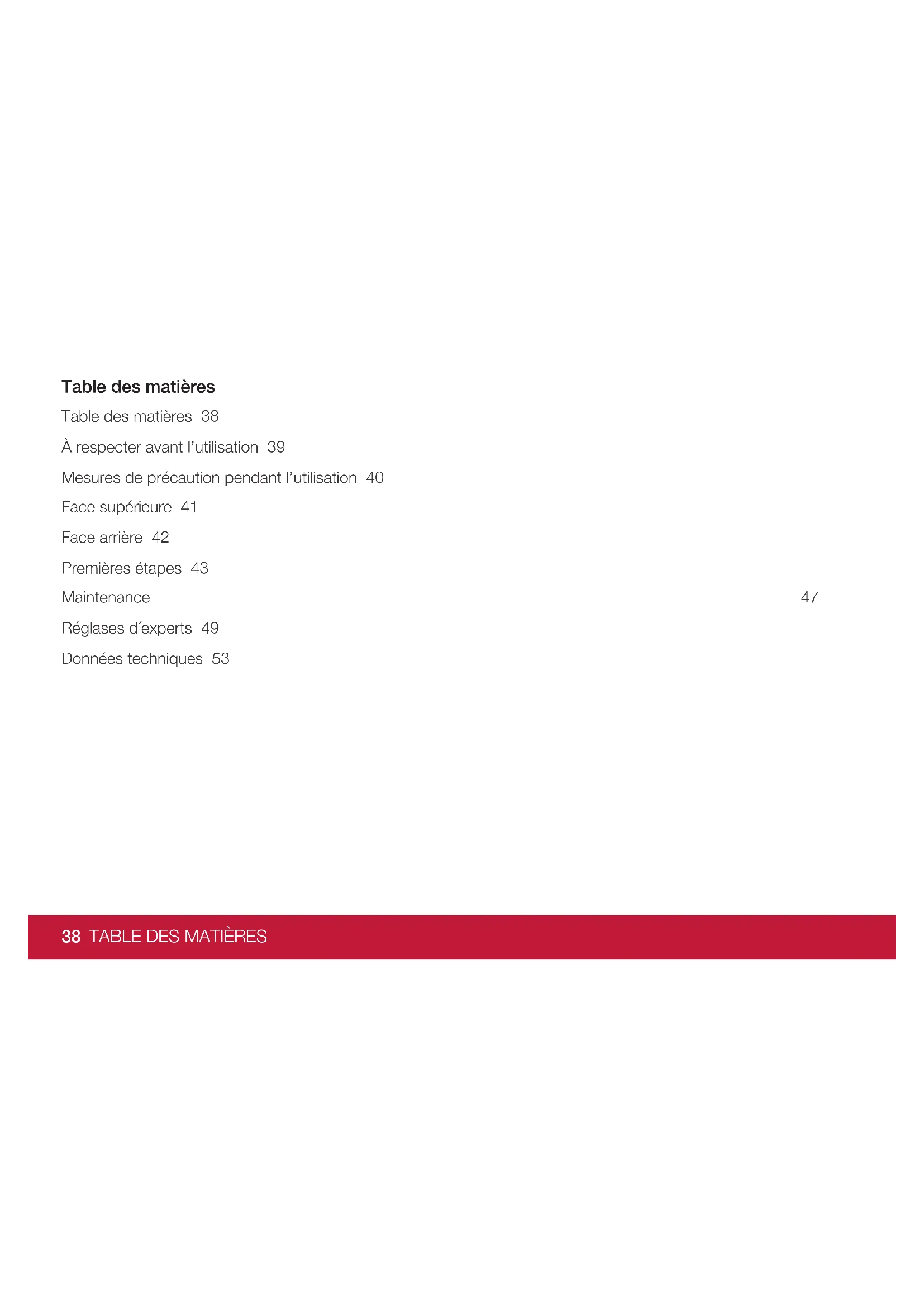 РУКОВОДСТВО ПОЛЬЗОВАТЕЛЯ 使用手册38 Table des matières Table des matières 38 À respecter avant l’utilisation 39 Mesures de précaution pendant l’utilisation 40 Face supérieure 41 Face arrière 42 Premières étapes 43 Maintenance 47 Réglases d´experts 49 Données techniques 53 TABLE DES MATIÈRES39À RESPECTER AVANT L’UTILISATION À respecter avant l’utilisation Nous vous remercions d’avoir choisi THORENS. Veuillez lire attentivement le présent manuel d’utilisation pour profiter des meilleures performances de votre platine tourne-disque.40 MESURES DE PRÉCAUTION PENDANT L’UTILISATION Mesures de précaution pendant l’utilisation Ne rien poser sur le capot de protection. Des objets posés sur le capot peuvent faire du bruit ou tomber à cause de vibrations, en particulier pendant la lecture d’un disque. Ne pas poser l’appareil sur un amplificateur ou un autre appareil qui soit source de chaleur. Cela pourrait en- traîner des décolorations, des déformations ou des dysfonctionnements. Éviter les emplacements exposés aux vibrations. Une quantité importante de poussières, le froid ou l’humidité peuvent endommager durablement l’appareil. La platine tourne-disque pouvant chauer pendant le fonctionnement, penser à laisser un espace susant pour la ventilation. Il faut notamment veiller lors de l’installation à maintenir un espace susant par rapport aux murs et à d‘autres appareils, afin de permettre une bonne dissipation de la chaleur. Ne pas déplacer ni soulever l’appareil lorsqu’il est en cours de fonctionnement et que le plateau tourne. Cela pourrait endommager le disque, l’aiguille de lecture, le système de cellule de lecture ou l’appareil. Toujours retirer le disque avant de déplacer ou de bouger cet appareil. Cela pourrait endommager le disque, l’aiguille de lecture et le système de cellule de lecture, ou entraîner des dysfonctionnements. La tension d‘alimentation de l’appareil doit correspondre à la tension indiquée à l’arrière de la platine. Si vous avez des doutes à ce sujet, veuillez contacter un vendeur spécialisé. Entretien Nettoyer la saleté sur le boîtier et le capot de protection avec un chion doux légèrement imbibé d’un produit de nettoyage neutre dilué dans de l‘eau.41 FACE SUPÉRIEURE