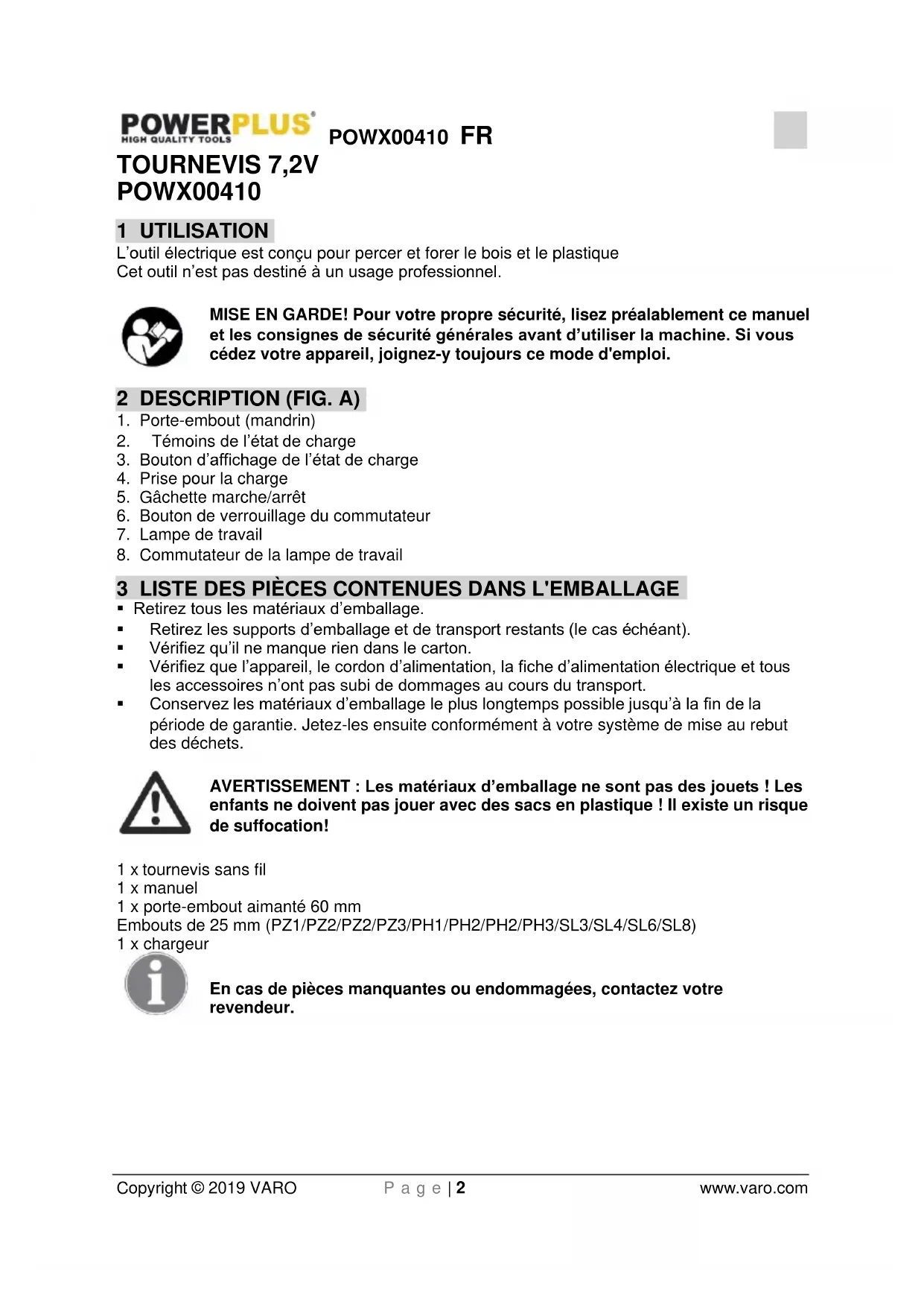 enfants ne doivent pas jouer avec des sacs en plastique ! Il existe un risque de suffocation! 1 x tournevis sans fil 1 x manuel 1 x porte-embout aimanté 60 mm Embouts de 25 mm (PZ1/PZ2/PZ2/PZ3/PH1/PH2/PH2/PH3/SL3/SL4/SL6/SL8) 1 x chargeur En cas de pièces manquantes ou endommagées, contactez votre revendeur.POWX00410 FR Copyright © 2019 VARO P a g e | 3 www.varo.com 4 PICTOGRAMMES Les symboles suivants sont utilisés dans ce mode d’emploi et/ou sur la machine:
