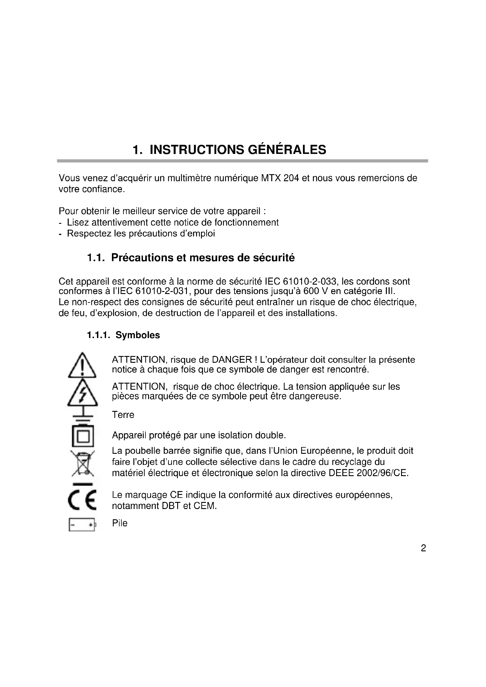 Vous venez d’acquérir un multimètre numérique MTX 204 et nous vous remercions de votre confiance. Pour obtenir le meilleur service de votre appareil : - Lisez attentivement cette notice de fonctionnement - Respectez les précautions d’emploi 1.1. Précautions et mesures de sécurité Cet appareil est conforme à la norme de sécurité IEC 61010-2-033, les cordons sont conformes à l’IEC 61010-2-031, pour des tensions jusqu’à 600 V en catégorie III. Le non-respect des consignes de sécurité peut entraîner un risque de choc électrique, de feu, d’explosion, de destruction de l’appareil et des installations.