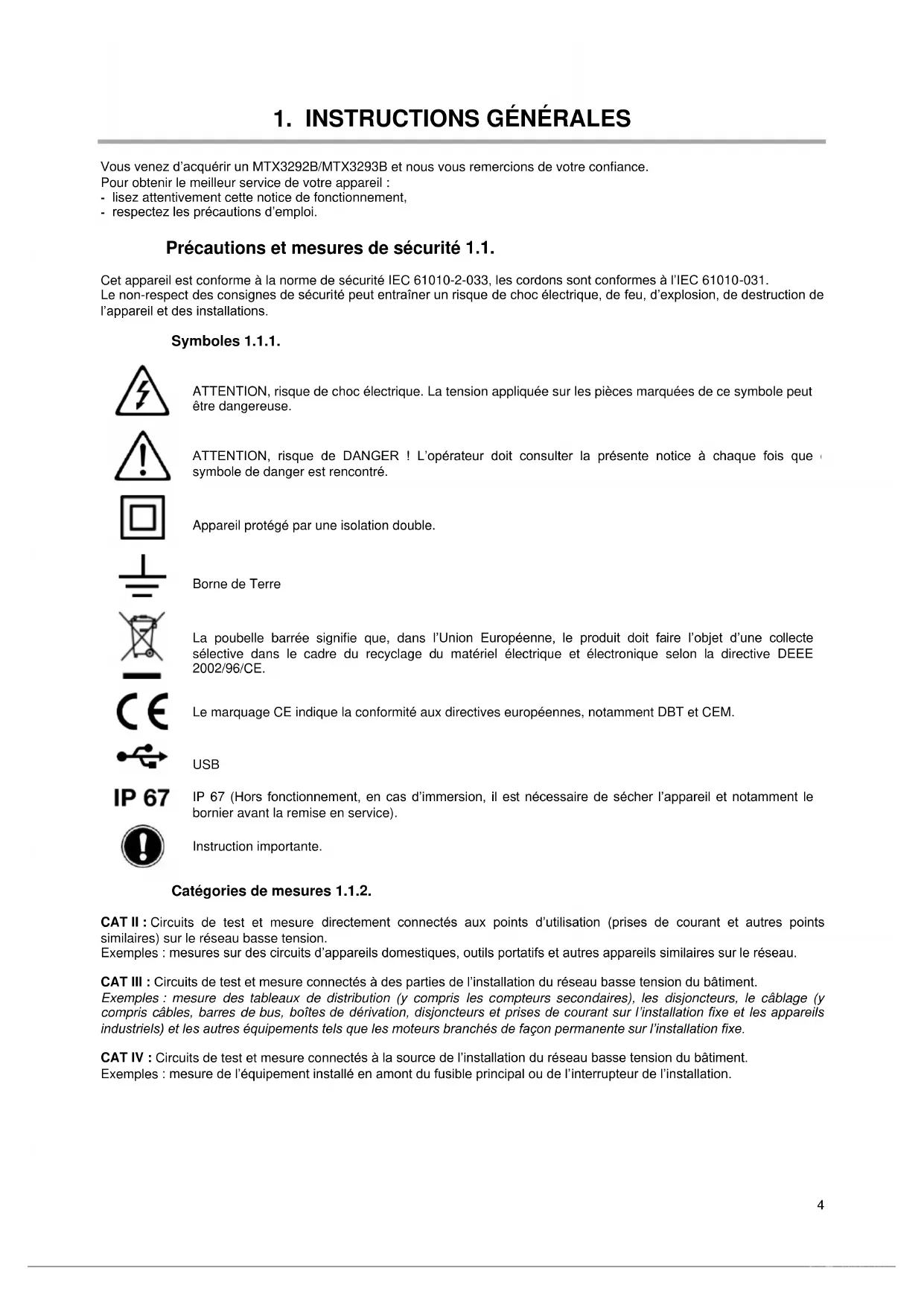 Vous venez d’acquérir un MTX3292B/MTX3293B et nous vous remercions de votre confiance. Pour obtenir le meilleur service de votre appareil : - lisez attentivement cette notice de fonctionnement, - respectez les précautions d’emploi. Précautions et mesures de sécurité 1.1. Cet appareil est conforme à la norme de sécurité IEC 61010-2-033, les cordons sont conformes à l’IEC 61010-031. Le non-respect des consignes de sécurité peut entraîner un risque de choc électrique, de feu, d’explosion, de destruction de l’appareil et des installations. Symboles 1.1.1.