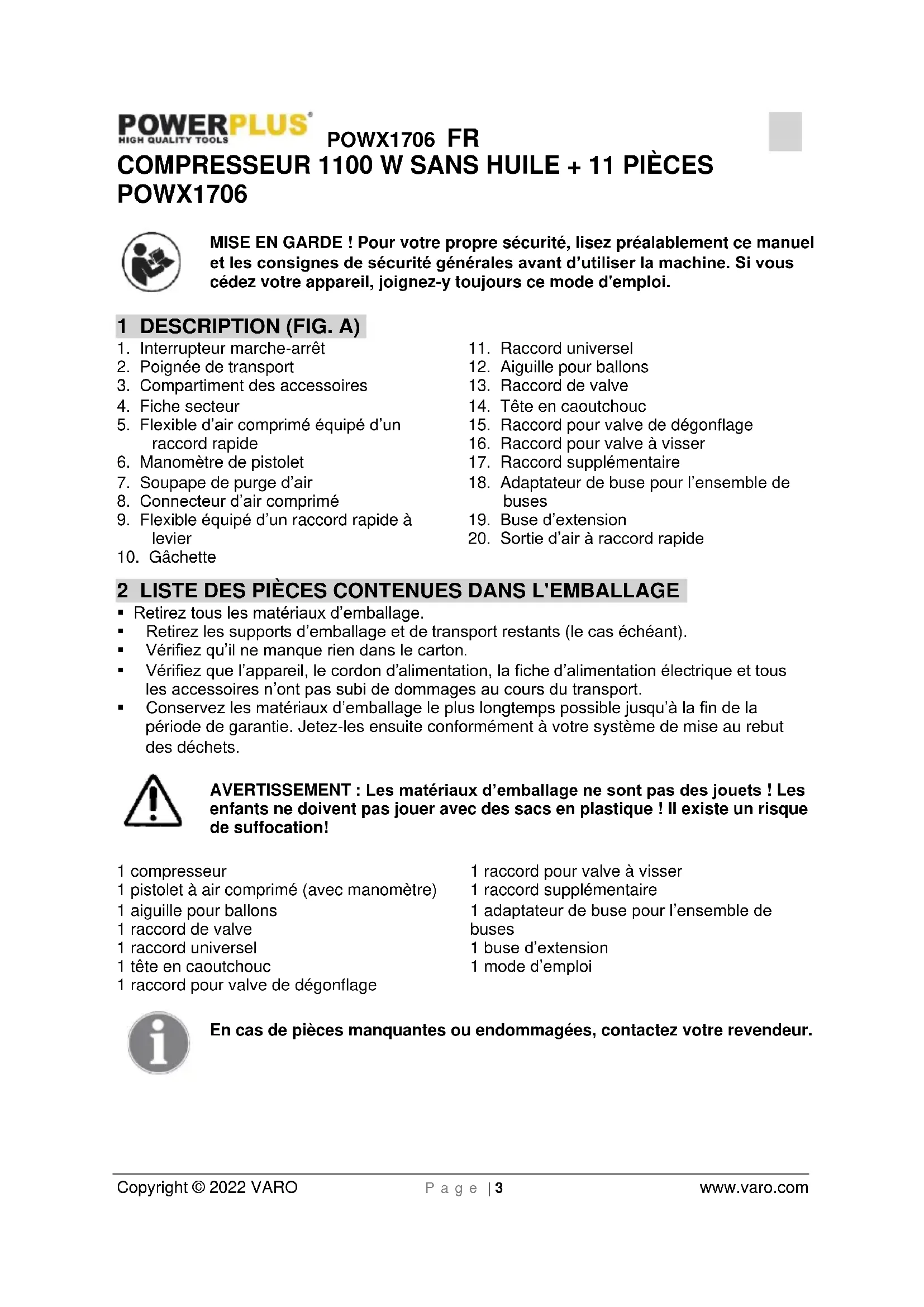 enfants ne doivent pas jouer avec des sacs en plastique ! Il existe un risque de suffocation! 1 compresseur 1 pistolet à air comprimé (avec manomètre) 1 aiguille pour ballons 1 raccord de valve 1 raccord universel 1 tête en caoutchouc 1 raccord pour valve de dégonflage 1 raccord pour valve à visser 1 raccord supplémentaire 1 adaptateur de buse pour l’ensemble de buses 1 buse d’extension 1 mode d’emploi En cas de pièces manquantes ou endommagées, contactez votre revendeur.POWX1706 FR Copyright © 2022 VARO P a g e | 4 www.varo.com 3 PICTOGRAMMES Les symboles suivants sont utilisés dans ce mode d’emploi et/ou sur la machine :