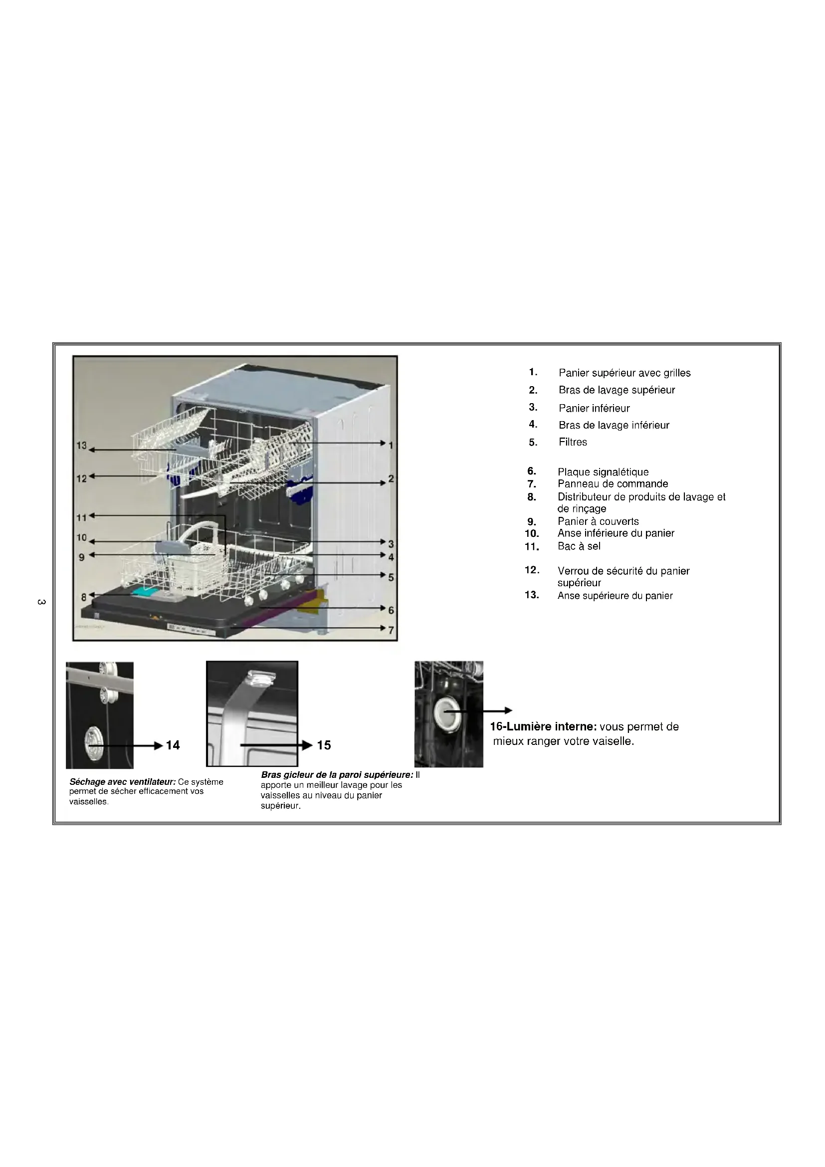 Anse inférieure du panier Bac à sel 13.Anse supérieure du panier 14 Bras gicleur de la paroi supérieure: Il apporte un meilleur lavage pour les vaisselles au niveau du panier supérieur. Séchage avec ventilateur: Ce système permet de sécher efficacement vos vaisselles.