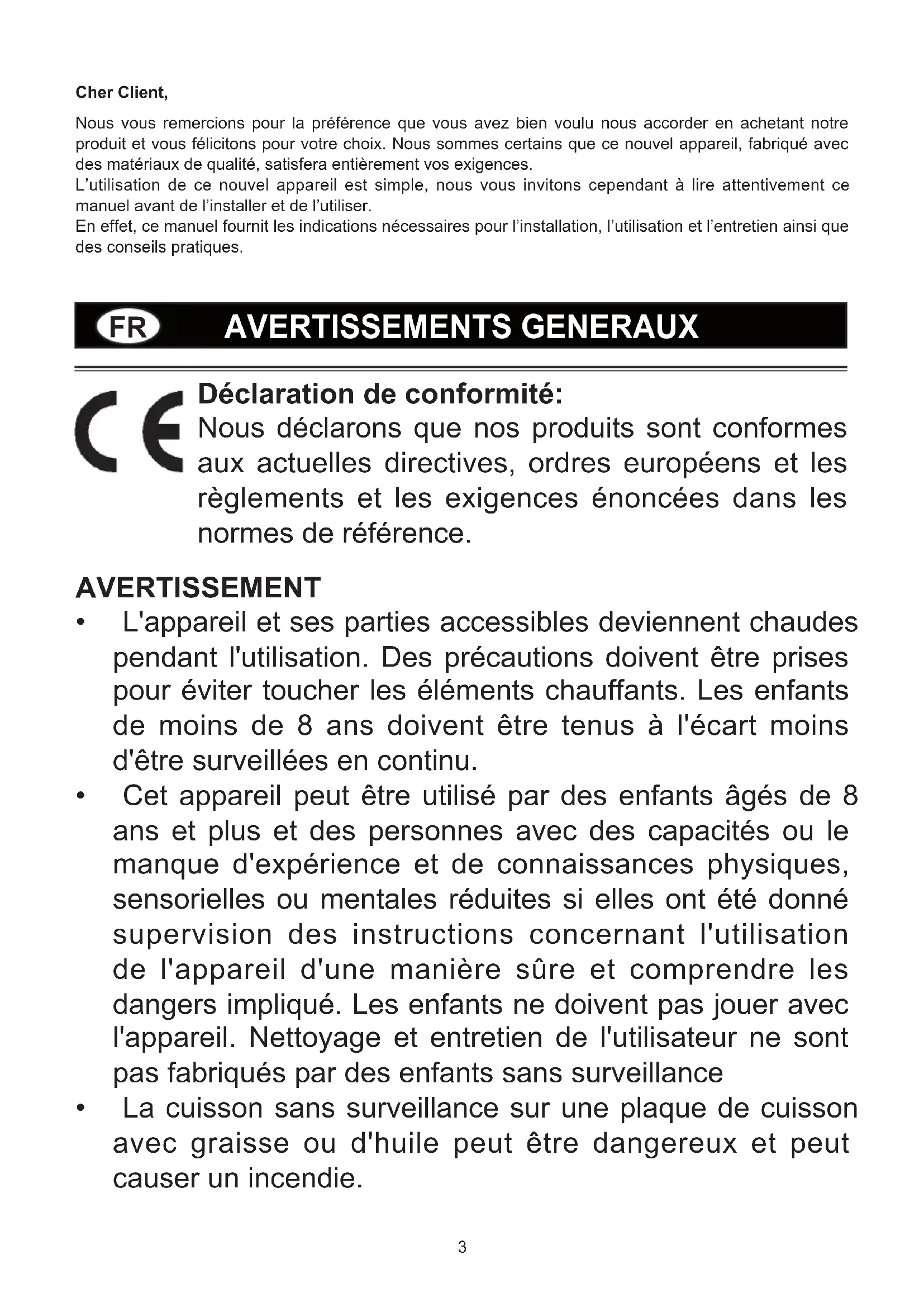 - La cuisson sans surveillance sur une plaque de cuisson avec graisse ou d'huile peut être dangereux et peut causer un incendie. Cher Client, Nous vous remercions pour la préférence que vous avez bien voulu nous accorder en achetant notre produit et vous félicitons pour votre choix. Nous sommes certains que ce nouvel appareil, fabriqué avec des matériaux de qualité, satisfera entièrement vos exigences. L’utilisation de ce nouvel appareil est simple, nous vous invitons cependant à lire attentivement ce manuel avant de l’installer et de l’utiliser. En effet, ce manuel fournit les indications nécessaires pour l’installation, l’utilisation et l’entretien ainsi que des conseils pratiques. LE FABRICANT AVERTISSEMENT4