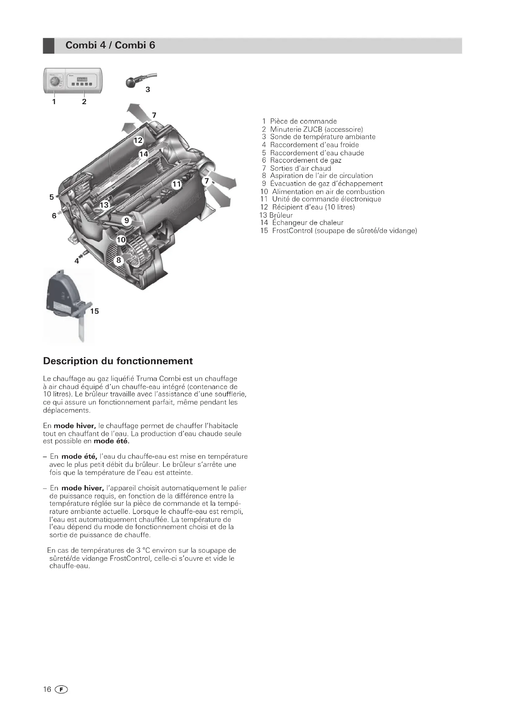 The manufacturer's address is: Truma Gerätetechnik GmbH & Co. KG, Wernher-von-Braun Strasse 12, 85640 Putzbrunn. In Germany, always notify the Truma Service Centre if prob- lems are encountered; in other countries the relevant service partners should be contacted (see Truma Service Booklet or www.truma.com). Any complaints are to be described in de- tail. In addition, the properly completed guarantee certificate is to be presented, or the factory number of the unit and the date of purchase given. In order for the manufacturers to be able to determine wheth- er an incident subject to guarantee has occurred, the end user must, at his own risk, bring the device to the manufacturers or send it to them. If there is damage to heaters (heat exchang- ers), the gas pressure regulator must also be sent back to the factory. In instances of the device being sent to the works, dispatch is to be effected by freight transport. In cases under guarantee, the works shall bear the transport costs or the costs of deliv- ery and return. If the damage is deemed not to be a warranty case, the manufacturer shall notify the customer and shall specify repair costs which shall not be borne by the manufac- turer; in this case, the customer shall also bear the shipping costs.1616 Description du fonctionnement Le chauffage au gaz liquéfié Truma Combi est un chauffage à air chaud équipé d‘un chauffe-eau intégré (contenance de 10 litres). Le brûleur travaille avec l’assistance d’une soufflerie, ce qui assure un fonctionnement parfait, même pendant les déplacements. En mode hiver, le chauffage permet de chauffer l’habitacle tout en chauffant de l’eau. La production d’eau chaude seule est possible en mode été. – En mode été, l’eau du chauffe-eau est mise en température avec le plus petit débit du brûleur. Le brûleur s’arrête une fois que la température de l’eau est atteinte. – En mode hiver, l’appareil choisit automatiquement le palier de puissance requis, en fonction de la différence entre la température réglée sur la pièce de commande et la tempé- rature ambiante actuelle. Lorsque le chauffe-eau est rempli, l’eau est automatiquement chauffée. La température de l’eau dépend du mode de fonctionnement choisi et de la sortie de puissance de chauffe. En cas de températures de 3 °C environ sur la soupape de sûreté/de vidange FrostControl, celle-ci s’ouvre et vide le chauffe-eau. 1 Pièce de commande 2 Minuterie ZUCB (accessoire) 3 Sonde de température ambiante 4 Raccordement d’eau froide 5 Raccordement d’eau chaude 6 Raccordement de gaz 7 Sorties d’air chaud 8 Aspiration de l‘air de circulation 9 Évacuation de gaz d’échappement 10 Alimentation en air de combustion 11 Unité de commande électronique 12 Récipient d’eau (10 litres) 13 Brûleur 14 Échangeur de chaleur 15 FrostControl (soupape de sûreté/de vidange)