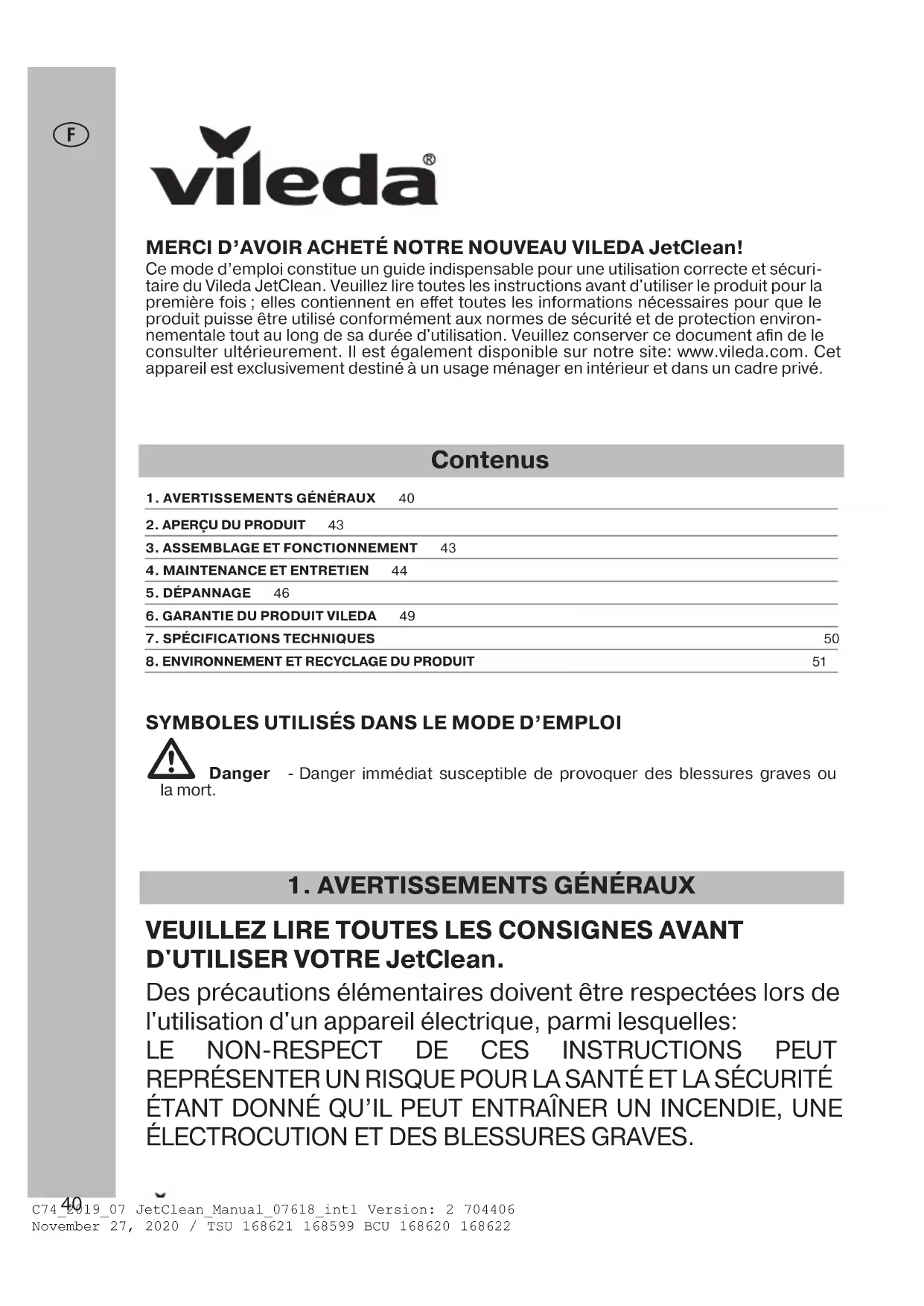 REPRÉSENTER UN RISQUE POUR LA SANTÉ ET LA SÉCURITÉ ÉTANT DONNÉ QU’IL PEUT ENTRAÎNER UN INCENDIE, UNE ÉLECTROCUTION ET DES BLESSURES GRAVES. MERCI D’AVOIR ACHETÉ NOTRE NOUVEAU VILEDA JetClean! Ce mode d’emploi constitue un guide indispensable pour une utilisation correcte et sécuri-taire du Vileda JetClean. Veuillez lire toutes les instructions avant d'utiliser le produit pour la première fois; elles contiennent en effet toutes les informations nécessaires pour que le produit puisse être utilisé conformément aux normes de sécurité et de protection environ-nementale tout au long de sa durée d'utilisation. Veuillez conserver ce document afin de le consulter ultérieurement. Il est également disponible sur notre site: www.vileda.com. Cet appareil est exclusivement destiné à un usage ménager en intérieur et dans un cadre privé. Contenus 1. AVERTISSEMENTS GÉNÉRAUX 402. APERÇU DU PRODUIT 433. ASSEMBLAGE ET FONCTIONNEMENT 434. MAINTENANCE ET ENTRETIEN 445. DÉPANNAGE 466. GARANTIE DU PRODUIT VILEDA 497. SPÉCIFICATIONS TECHNIQUES 508. ENVIRONNEMENT ET RECYCLAGE DU PRODUIT 51C74_2019_07 JetClean_Manual_07618_intl Version: 2 704406November 27, 2020 / TSU 168621 168599 BCU 168620 16862241