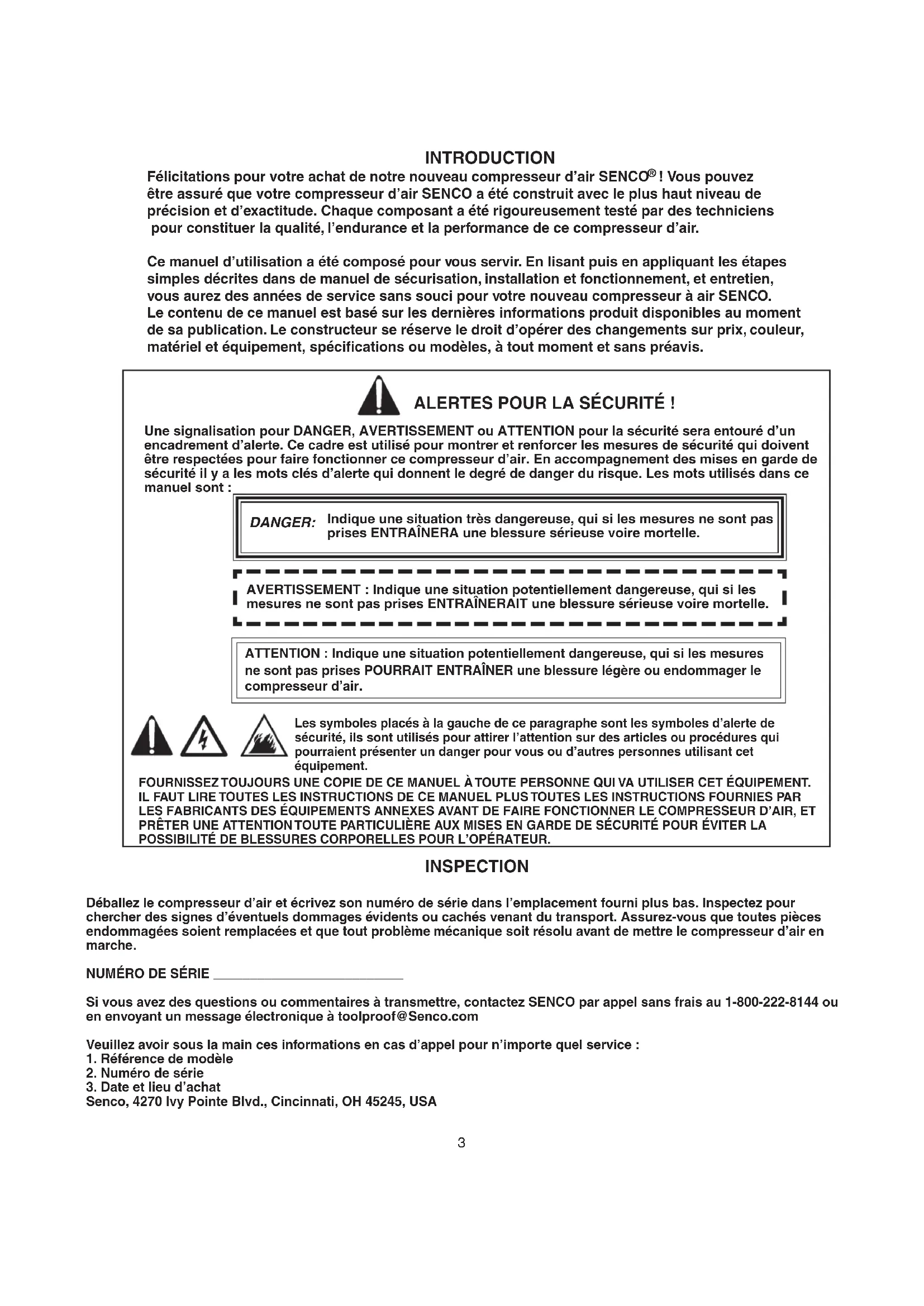 ! Vous pouvez être assuré que votre compresseur d’air SENCO a été construit avec le plus haut niveau de précision et d’exactitude. Chaque composant a été rigoureusement testé par des techniciens pour constituer la qualité, l’endurance et la performance de ce compresseur d’air. Ce manuel d’utilisation a été composé pour vous servir. En lisant puis en appliquant les étapes simples décrites dans de manuel de sécurisation, installation et fonctionnement, et entretien, vous aurez des années de service sans souci pour votre nouveau compresseur à air SENCO. Le contenu de ce manuel est basé sur les dernières informations produit disponibles au moment de sa publication. Le constructeur se réserve le droit d’opérer des changements sur prix, couleur, matériel et équipement, spécifications ou modèles, à tout moment et sans préavis. ALERTES POUR LA SÉCURITÉ ! Une signalisation pour DANGER, AVERTISSEMENT ou ATTENTION pour la sécurité sera entouré d’un encadrement d’alerte. Ce cadre est utilisé pour montrer et renforcer les mesures de sécurité qui doivent être respectées pour faire fonctionner ce compresseur d’air. En accompagnement des mises en garde de sécurité il y a les mots clés d’alerte qui donnent le degré de danger du risque. Les mots utilisés dans ce manuel sont : Indique une situation très dangereuse, qui si les mesures ne sont pas prises ENTRAÎNERA une blessure sérieuse voire mortelle.