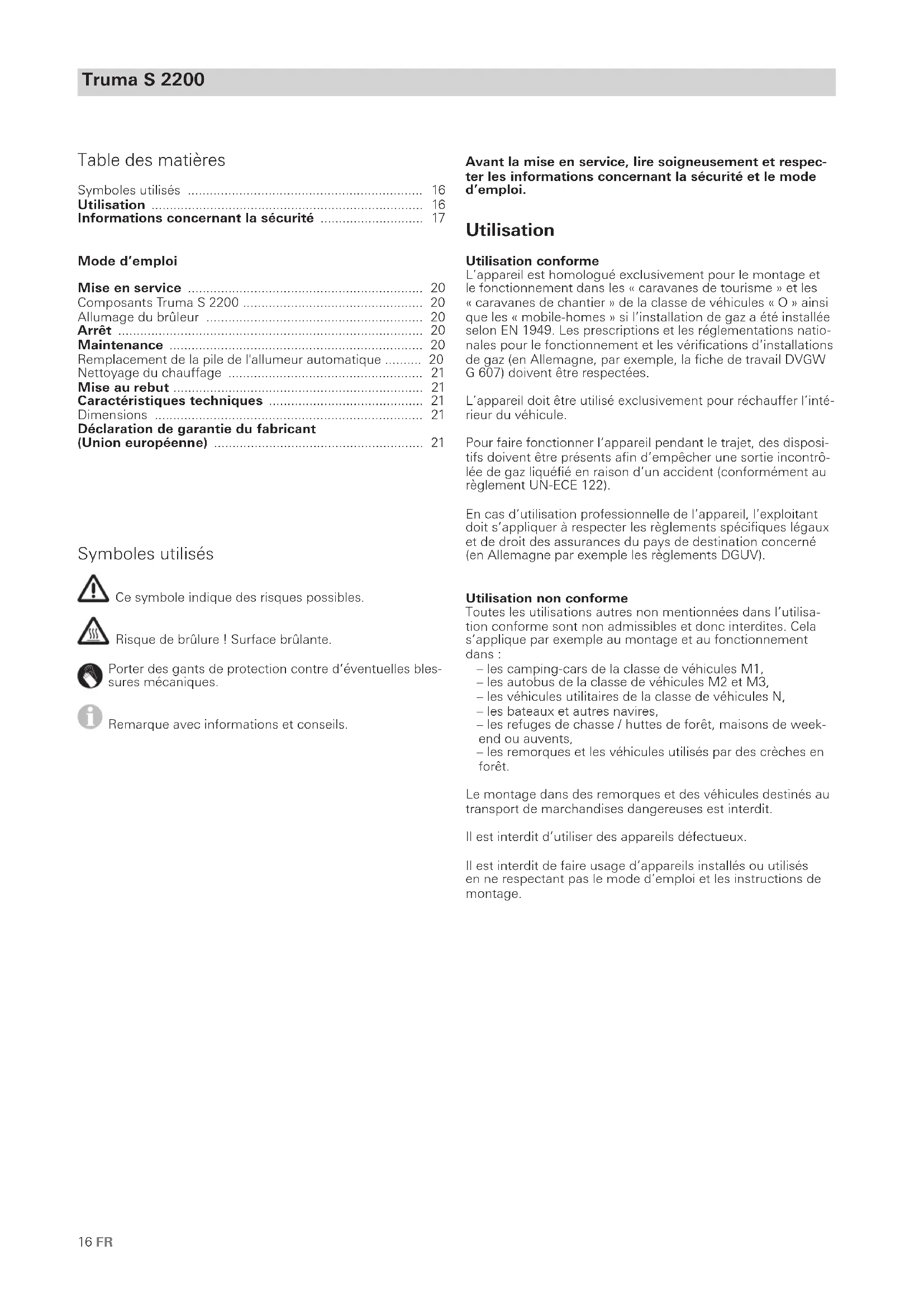 - The warranty must be claimed with an authorised service part- ner or at the Truma Service Centre. All the relevant addresses and phone numbers can be found at www.truma.com, in the “Service” section. The Manufacturer‘s address is: Truma Gerätetechnik GmbH & Co. KG Truma Servicezentrum Wernher-von-Braun-Straße 12 85640 Putzbrunn, Germany To ensure a smooth procedure, we would be grateful if you could have the following details ready before contacting us: – Detailed description of the defect – Serial number of the appliance – Date of purchase The authorised service partner or the Truma Service Centre will then specify the further procedure. To avoid transport damage, the affected appliance must only be shipped by prior arrangement with the authorised service partner or the Truma Service Centre. If the warranty claim is recognised by the Manufacturer, then the transport expenses shall be borne by the same. If no warranty claim is applicable, the Consumer will be notified accordingly and any repair and transport expenses shall then be the Consumer’s liability. We ask you not to send in an ap- pliance without prior arrangement.16 FR Truma S 2200 Avant la mise en service, lire soigneusement et respec- ter les informations concernant la sécurité et le mode d’emploi. Utilisation Utilisation conforme L’appareil est homologué exclusivement pour le montage et le fonctionnement dans les «caravanes de tourisme» et les «caravanes de chantier» de la classe de véhicules «O» ainsi que les «mobile-homes» si l’installation de gaz a été installée selon EN1949. Les prescriptions et les réglementations natio- nales pour le fonctionnement et les vérifications d’installations de gaz (en Allemagne, par exemple, la fiche de travail DVGW G 607) doivent être respectées. L’appareil doit être utilisé exclusivement pour réchauffer l’inté- rieur du véhicule. Pour faire fonctionner l’appareil pendant le trajet, des disposi- tifs doivent être présents afin d’empêcher une sortie incontrô- lée de gaz liquéfié en raison d’un accident (conformément au règlement UN-ECE 122). En cas d’utilisation professionnelle de l’appareil, l’exploitant doit s’appliquer à respecter les règlements spécifiques légaux et de droit des assurances du pays de destination concerné (en Allemagne par exemple les règlements DGUV). Utilisation non conforme Toutes les utilisations autres non mentionnées dans l’utilisa- tion conforme sont non admissibles et donc interdites. Cela s’applique par exemple au montage et au fonctionnement dans: – les camping-cars de la classe de véhicules M1, – les autobus de la classe de véhicules M2 et M3, – les véhicules utilitaires de la classe de véhicules N, – les bateaux et autres navires, – les refuges de chasse / huttes de forêt, maisons de week- end ou auvents, – les remorques et les véhicules utilisés par des crèches en forêt. Le montage dans des remorques et des véhicules destinés au transport de marchandises dangereuses est interdit. Il est interdit d’utiliser des appareils défectueux. Il est interdit de faire usage d’appareils installés ou utilisés en ne respectant pas le mode d’emploi et les instructions de montage. Symboles utilisés Ce symbole indique des risques possibles. Risque de brûlure! Surface brûlante. Porter des gants de protection contre d’éventuelles bles- sures mécaniques. Remarque avec informations et conseils. Table des matières Symboles utilisés p. 16