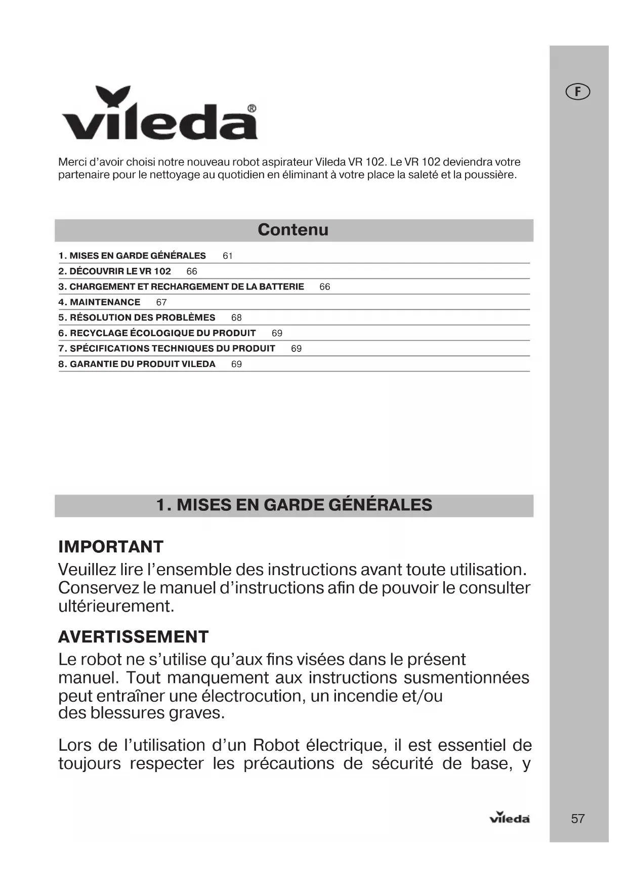 IMPORTANT Veuillez lire l’ensemble des instructions avant toute utilisation. Conservez le manuel d’instructions afin de pouvoir le consulter ultérieurement. AVERTISSEMENT Le robot ne s’utilise qu’aux fins visées dans le présent manuel. Tout manquement aux instructions susmentionnées peut entraîner une électrocution, un incendie et/ou des blessures graves. Lors de l’utilisation d’un Robot électrique, il est essentiel de toujours respecter les précautions de sécurité de base, y Merci d’avoir choisi notre nouveau robot aspirateur Vileda VR 102. Le VR 102 deviendra votre partenaire pour le nettoyage au quotidien en éliminant à votre place la saleté et la poussière. Contenu 1. MISES EN GARDE GÉNÉRALES 612. DÉCOUVRIR LE VR 102 663. CHARGEMENT ET RECHARGEMENT DE LA BATTERIE 664. MAINTENANCE 675. RÉSOLUTION DES PROBLÈMES 686. RECYCLAGE ÉCOLOGIQUE DU PRODUIT 697. SPÉCIFICATIONS TECHNIQUES DU PRODUIT 698. GARANTIE DU PRODUIT VILEDA 6958