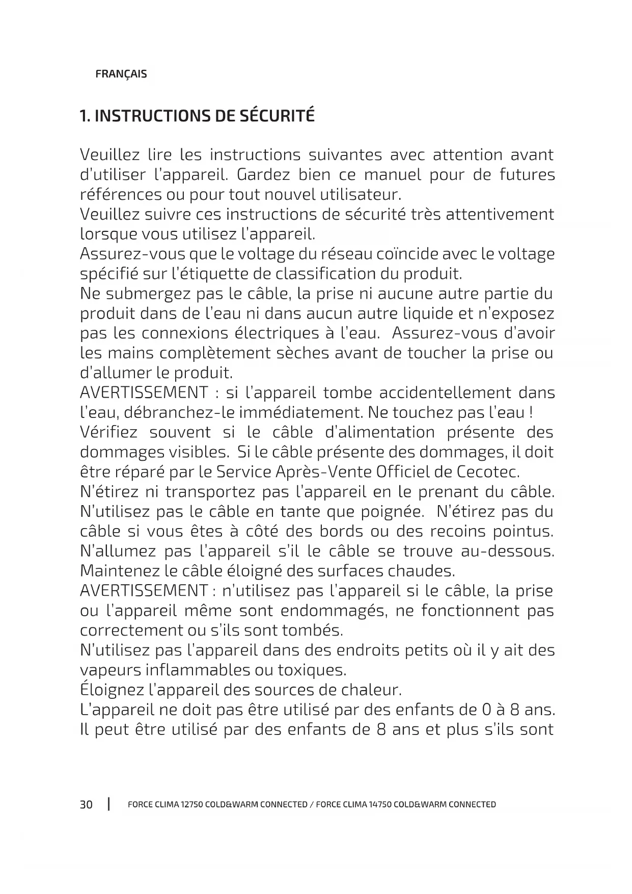 FRANÇAIS surveillés constamment. Cet appareil peut être utilisé par des personnes aux capacités physiques, mentales ou sensorielles réduites, ou sans expérience ni connaissances si elles sont surveillées et/ou ont reçu les informations nécessaires à sa correcte utilisation et qu’elles ont bien compris les risques qu’il implique. Surveillez les enfants pour vous assurer qu’ils ne jouent pas avec l’appareil. Une surveillance stricte est nécessaire si le produit est utilisé par ou à côté des enfants. Maintenez l’appareil et son câble hors de la portée des enfants de moins de 8 ans. Ne laissez pas l’appareil sans surveillance lorsqu’il est en fonctionnement. Débranchez l’appareil lorsque vous avez terminé de l’utiliser et lorsque vous sortez de la pièce dans laquelle il est installé. N’essayez pas de réparer l’appareil vous-même. Veuillez contacter le Service Après-Vente Officiel de Cecotec pour tout doute ou renseignement. Éteignez et déconnectez l’appareil de la prise de courant lorsque vous ne l’utilisez pas, lorsque vous le transportez ou avant de l’assembler ou démonter. Pour éviter que l’appareil tombe, enroulez le câble. Pour assurer le correct fonctionnement de l’appareil, le nettoyage et l’entretien doivent être réalisés en accord avec ce manuel d’instructions. Éteignez et débranchez l’appareil avant de le déplacer ou de le nettoyer. Le nettoyage et l’entretien ne doivent pas être réalisés par des enfants. Rangez l’appareil et son manuel d’instructions dans un lieu sec et sécurisé lorsque vous n’allez pas l’utiliser. Placez l’appareil sur une surface plate et sèche. L’appareil doit être installé à 50 cm, au minimum, d’autres objets ou murs.FORCE CLIMA 12750 COLD&WARM CONNECTED / FORCE CLIMA 14750 COLD&WARM CONNECTED