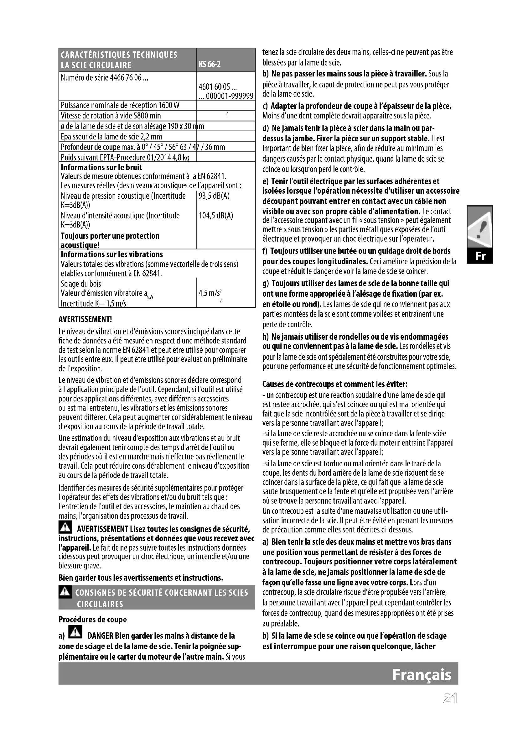 AVERTISSEMENT! Le niveau de vibration et d'émissions sonores indiqué dans cette che de données a été mesuré en respect d'une méthode standard de test selon la norme EN 62841 et peut être utilisé pour comparer les outils entre eux. Il peut être utilisé pour évaluation préliminaire de l'exposition. Le niveau de vibration et d'émissions sonores déclaré correspond à l'application principale de l'outil. Cependant, si l'outil est utilisé pour des applications diérentes, avec diérents accessoires ou est mal entretenu, les vibrations et les émissions sonores peuvent diérer. Cela peut augmenter considérablement le niveau d'exposition au cours de la période de travail totale. Une estimation du niveau d'exposition aux vibrations et au bruit devrait également tenir compte des temps d'arrêt de l'outil ou des périodes où il est en marche mais n'eectue pas réellement le travail. Cela peut réduire considérablement le niveau d'exposition au cours de la période de travail totale. Identier des mesures de sécurité supplémentaires pour protéger l'opérateur des eets des vibrations et/ou du bruit tels que : l'entretien de l'outil et des accessoires, le maintien au chaud des mains, l'organisation des processus de travail. AVERTISSEMENT Lisez toutes les consignes de sécurité, instructions, présentations et données que vous recevez avec l'appareil. Le fait de ne pas suivre toutes les instructions données cidessous peut provoquer un choc électrique, un incendie et/ou une blessure grave. Bien garder tous les avertissements et instructions. CONSIGNES DE SÉCURITÉ CONCERNANT LES SCIES CIRCULAIRES Procédures de coupe